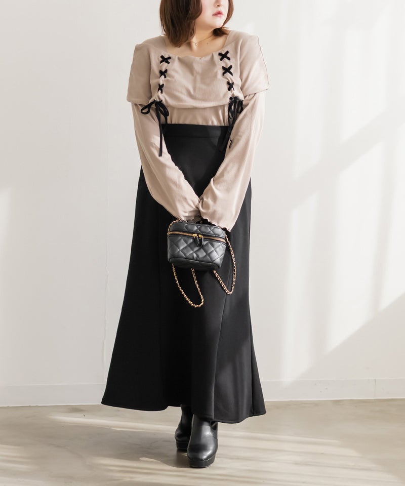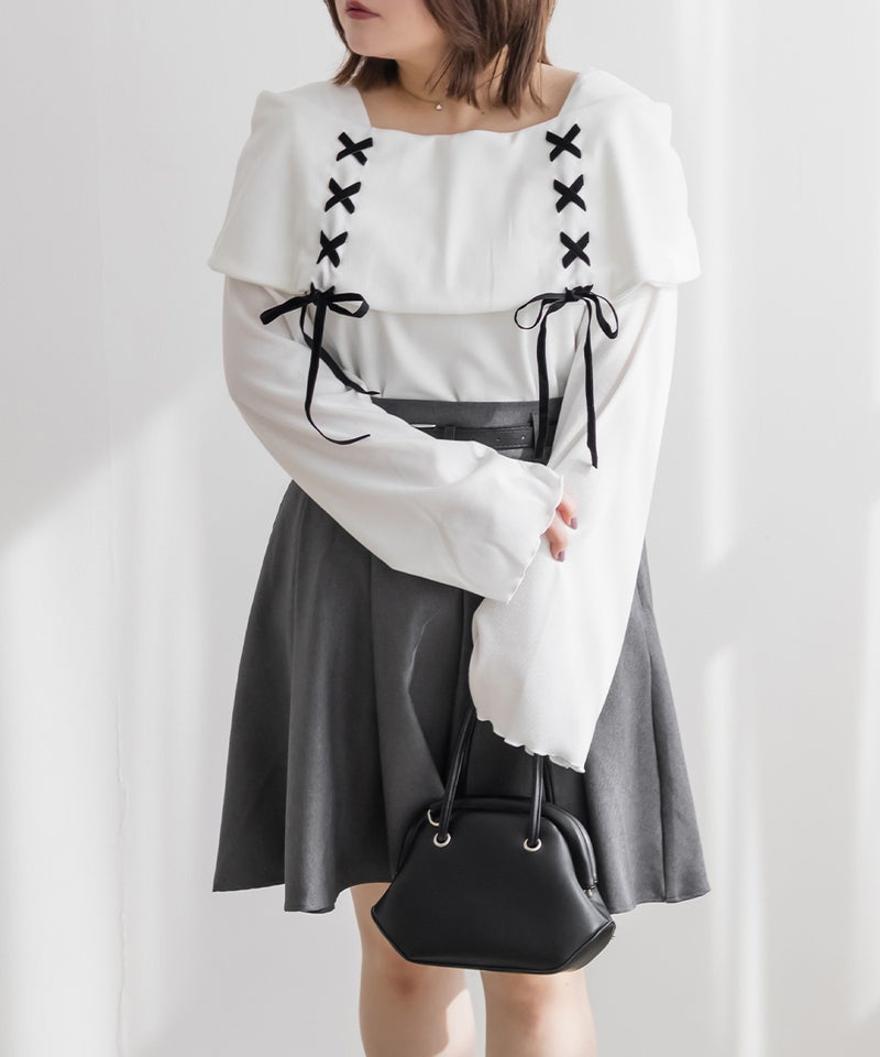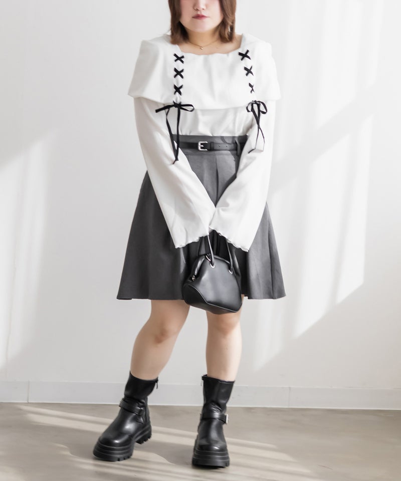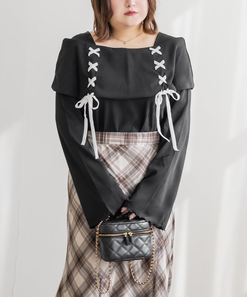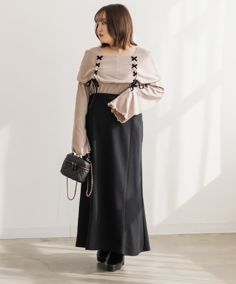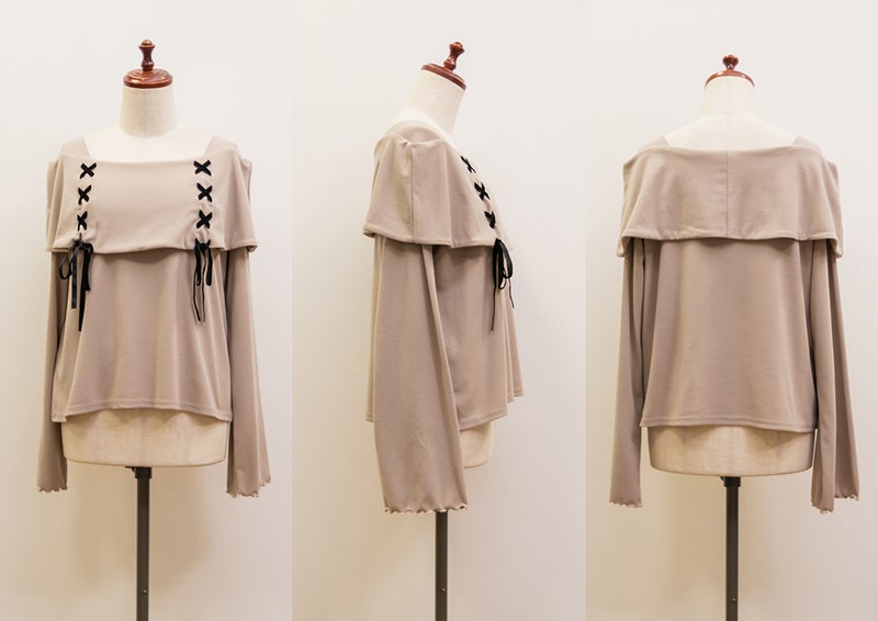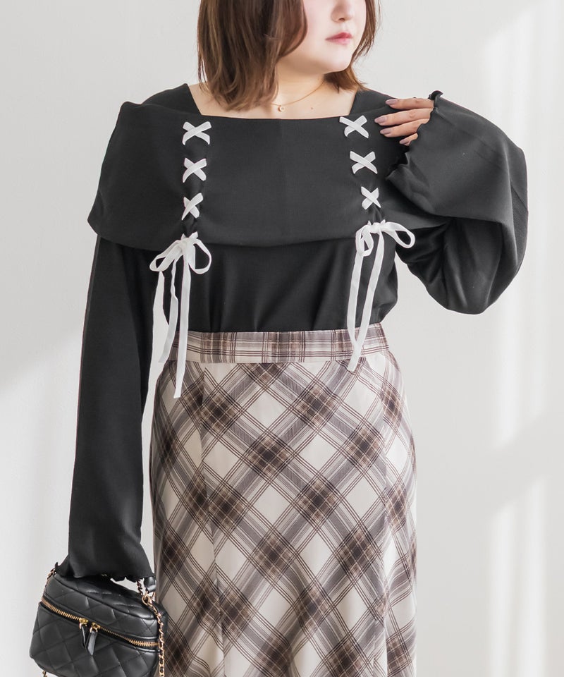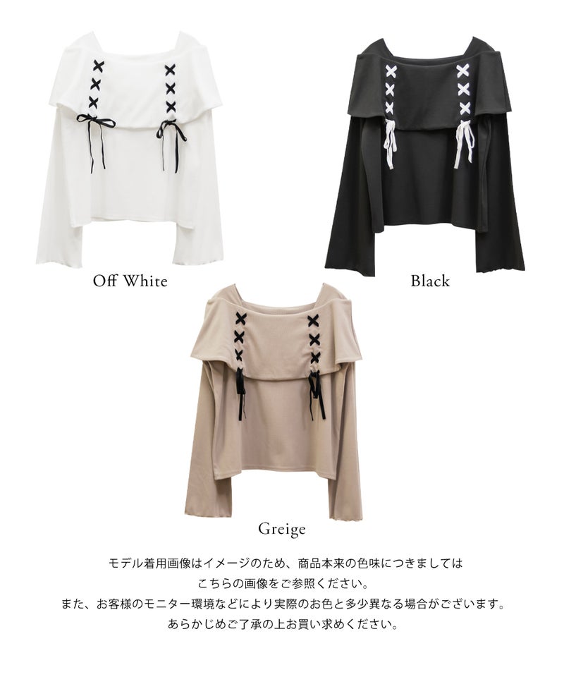 LLを着用してちょうどいいサイズ感でした。ネック回りが綺麗に開きながら、下着の肩紐が見えないようなデザインになっているのがポイントでインナーに困らないのが嬉しい!オフショルは苦手だけど女性らしいデザインを探している方におすすめです♪レースアップのリボンがアクセントになっていて、メリハリのあるすっきりとした印象になれます!袖もフレアに広がっていて女性らしさたっぷりで手元もおしゃれで可愛い◎丈はタックインせずに着られるのでパンツともスカートも相性のいい1枚持っておきたいトップスです!