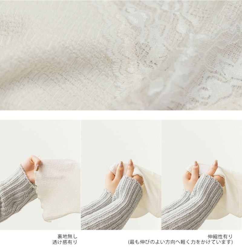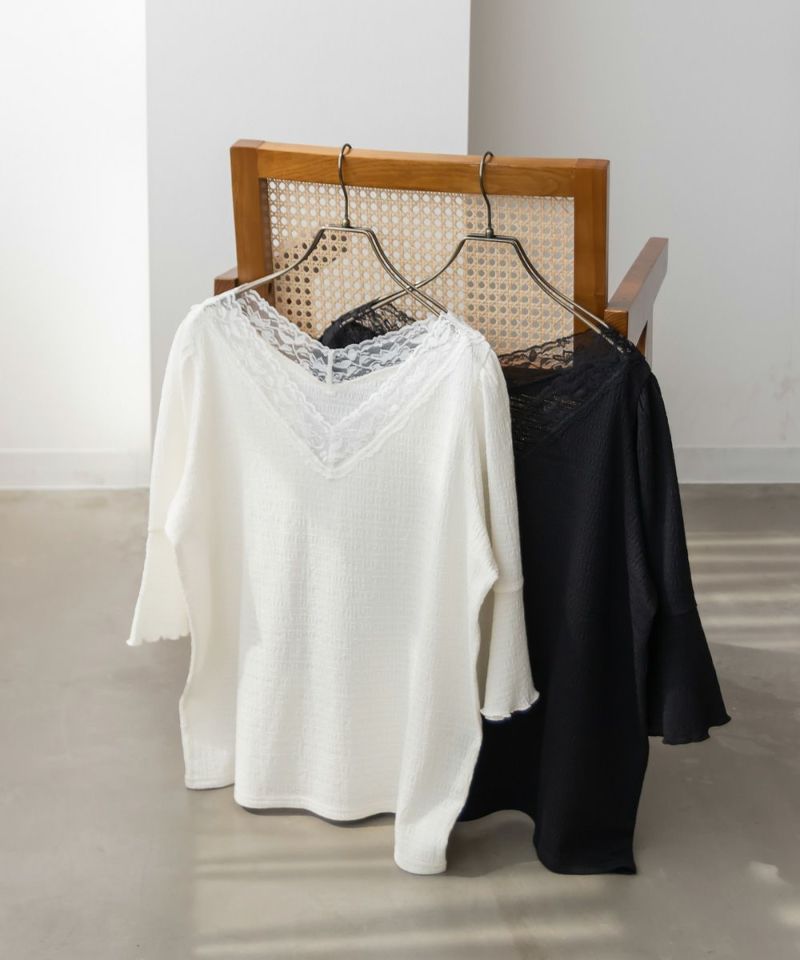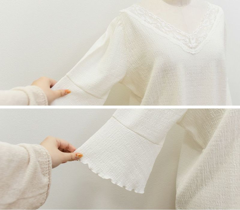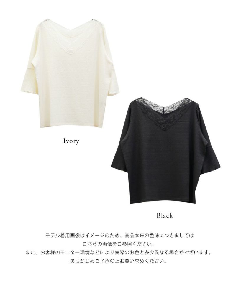 3Lサイズを着用して、身幅や腕まわりにほどよくゆとりがあり、ちょうどいいサイズ感でした◎ 首元のレースデザインが上品で、顔まわりを華やかに見せてくれます♪ フレアスリーブは、締め付け感がなく軽やかに広がってくれるので、二の腕も手首も自然に華奢な印象にしてくれるのが嬉しいポイント。 生地はさらっとしていて軽やかなので、暑い日にも快適に着られました! きれいめにもカジュアルにも合わせやすく、ボトムを選ばない万能トップスです。