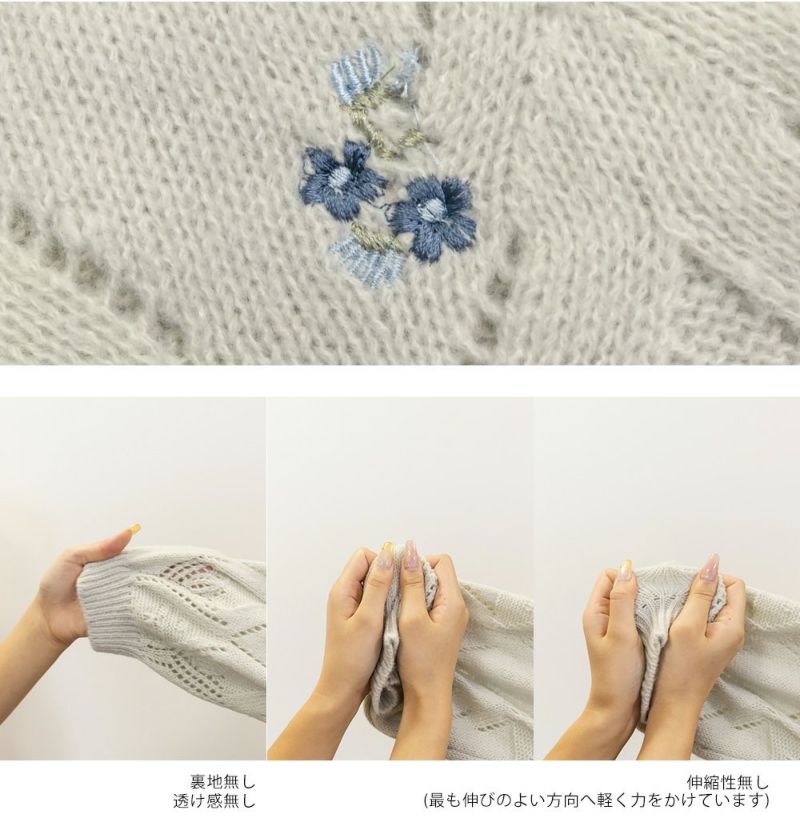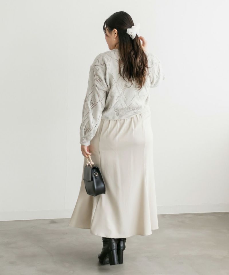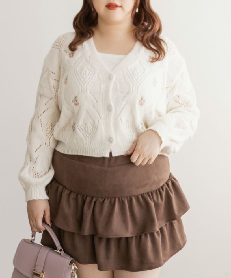 3Lサイズを着用してぴったりのサイズでした。透かし編みのざっくり感がかわいいカーディガンで、トップスとしても羽織としても着回しできる万能アイテムです!花柄の刺繍がポイントになってとっても可愛いです◎スカートやパンツはもちろんワンピースにも相性良くコーデできます♪インナーをタンクトップから長袖にしたりして長いシーズン着回しできるのも嬉しいです。