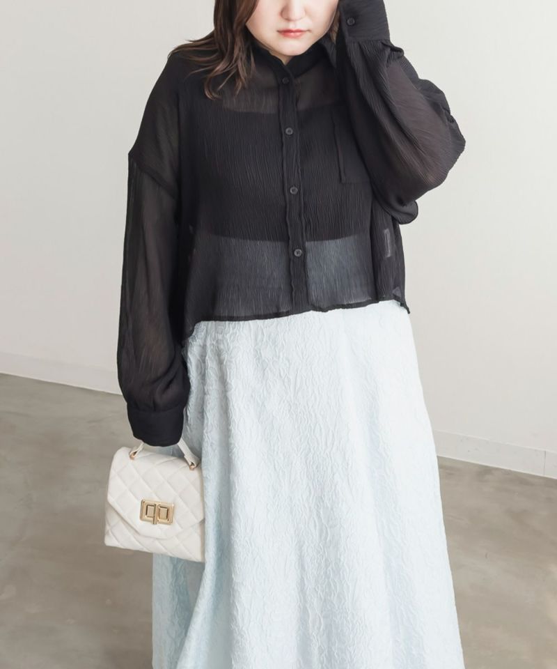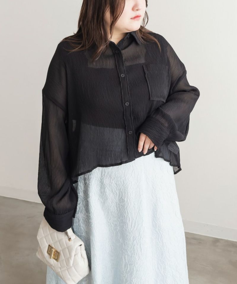 3Lサイズを着用しました。程よくゆとりがあって動きやすく、軽やかな着心地です!透け感が可愛いシアー素材で、少し楊柳っぽい凹凸の生地がかわいいです◎シアーの素材が上品で、カジュアルにもきれいめにも合わせやすい万能アイテムです。短丈なので、アウトしてちょうどよくスタイルアップして見えました!オールシーズン使いまわせるシャツはバリエーション違いでもっておきたいアイテムです♪