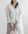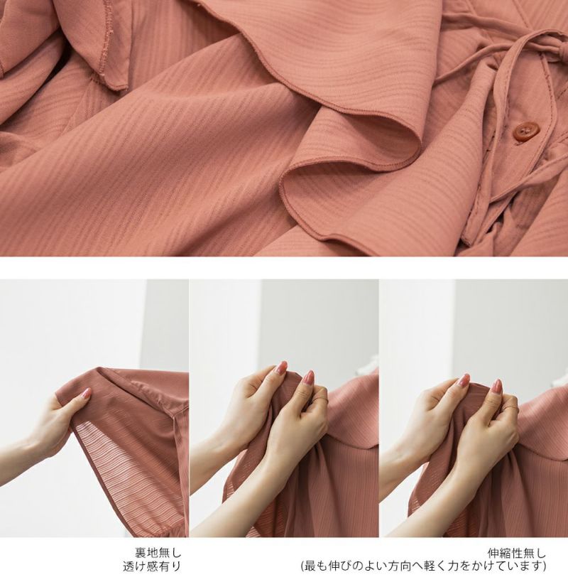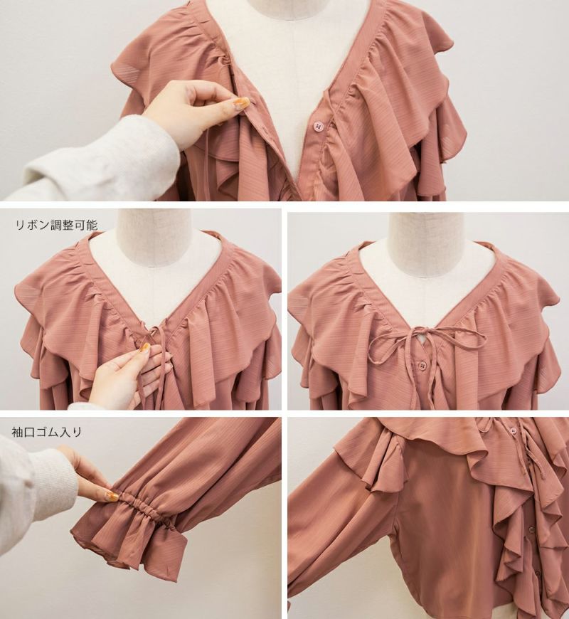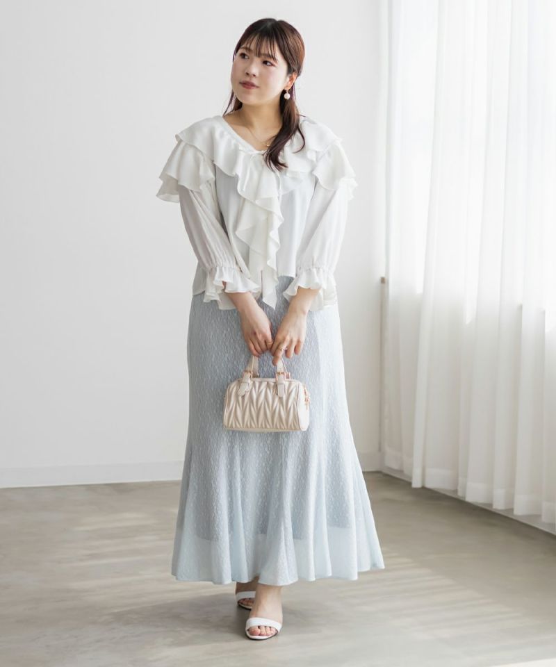 3Lを着て着用感はちょうどよく、肩まわりやバストにも程よくゆとりがあって、リラックスして着られました。胸元のリボンとフリル使いがポイントになった、華やかでガーリーな雰囲気のブラウスです♪ふわっと広がる袖のシルエットが可愛く、気になる二の腕も自然にカバーしてくれました◎首元は開きすぎず、Vネックなのですっきりとした印象で着られます。生地はさらっとしていて軽く、暑い季節でも快適に着られそうな印象でした。丈感も長すぎず短すぎずで、どんなボトムにも合わせやすいバランスです。
