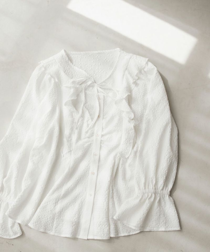 3Lサイズを着用してちょうどいいサイズ感でした。ウエストにタックが入っていて切替が無いのにメリハリが出てすっきりした印象で着用できました♪デコルテのリボンは女性らしいポイントになってネックレスいらずなのも嬉しいです◎ウエストはくびれて見えるデザインでスタイルアップ効果も◎凹凸のある軽い生地で長いシーズン着やすいです。袖もふんわりして二の腕カバーもバッチリで、デートやお出かけに着ていきたくなる1枚で着映えするブラウスです!