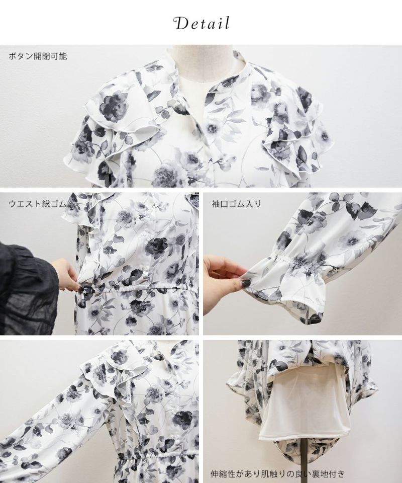 3Lサイズを着用していつも通りのサイズ感でした。ウエストはゴム入りでフィット&フレアのシルエットが女性らしいワンピースです!大人っぽいモノトーンの花柄で使いやすいワンピースです。肩にフリルがついていて肩回りの丸みをカバーしてくれます♪軽い着心地なのでお出かけや旅行など動くシーンにもおすすめです◎