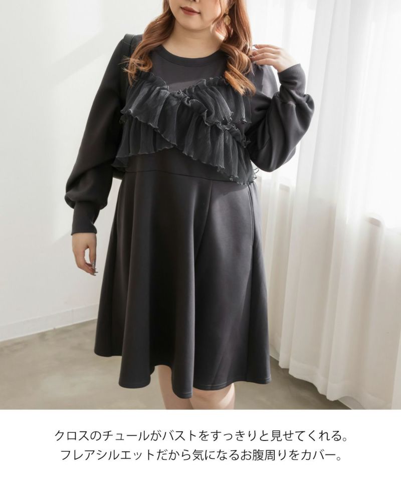 3Lを着て丁度いいサイズでした。トレンドのチュール生地を使ったビスチェをレイヤードしたようなデザインで1枚でかわいい!らくちんなワンピにチュールがくっついていてお腹や二の腕など気になる部分をしっかりカバーしてくれます◎1枚でフェミニンなスタイルが完成するコーデいらずの可愛いワンピースです!ボディラインを拾いにくい生地感とディティールがポイントです!重ね着が苦手な方でも悩まずにレイヤードスタイルになれて、可愛いだけじゃなくて着やせを考えたデザインなのが嬉しいです!