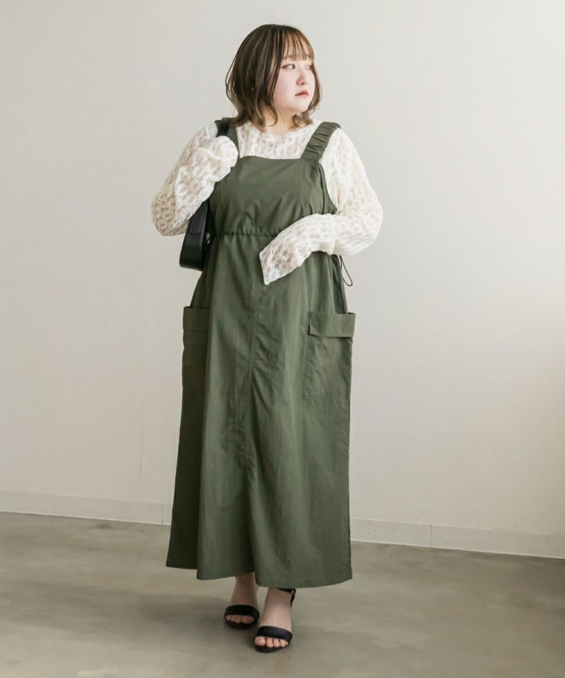 3Lサイズを着用して、全体的にゆったりとしたサイズ感でした♪ ウエスト部分はドロスト仕様になっていて、絞ることでシルエットの調整ができるのが嬉しいポイント◎ ストンと落ちるロング丈ですが、軽い生地感で動きやすく、リラックス感のある着心地でした! 大きめのポケットがアクセントになっていて、カジュアルな雰囲気に♪ 今回はレーストップスと合わせてフェミニンな印象にしましたが、Tシャツやスウェットと合わせればカジュアルにも着こなせる万能ワンピースです!
