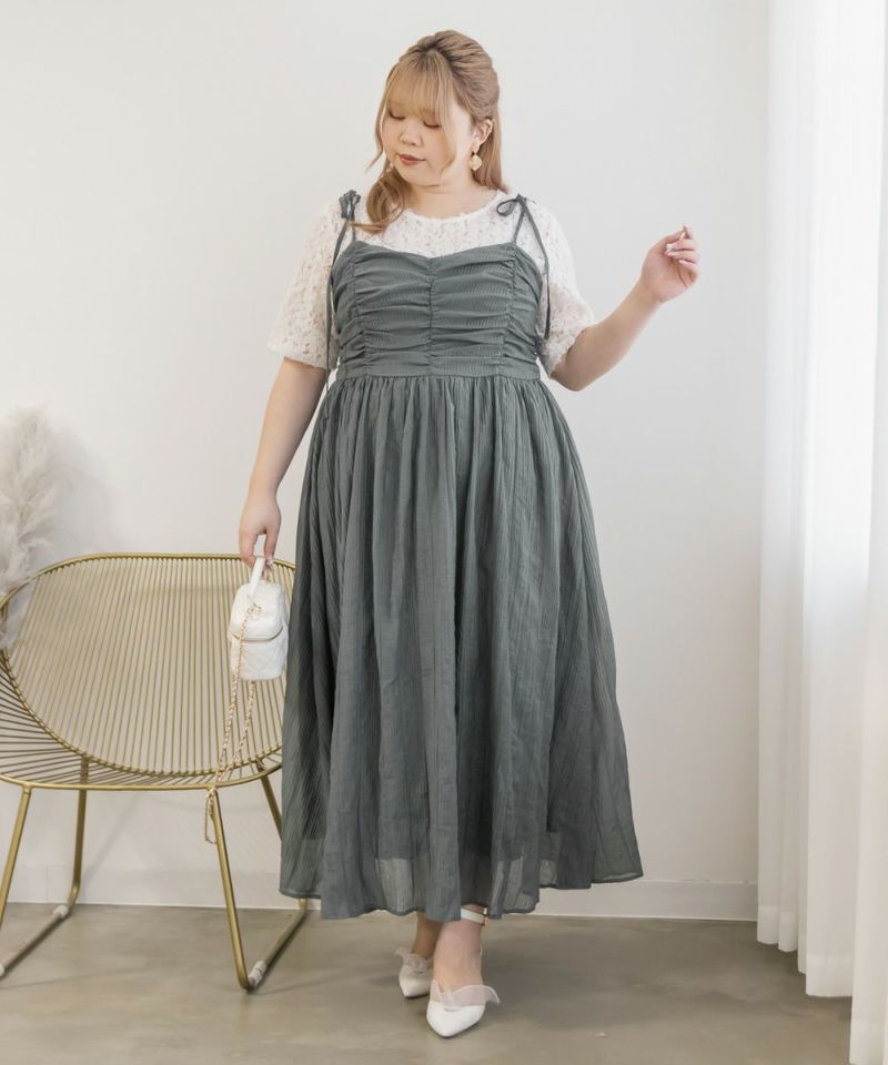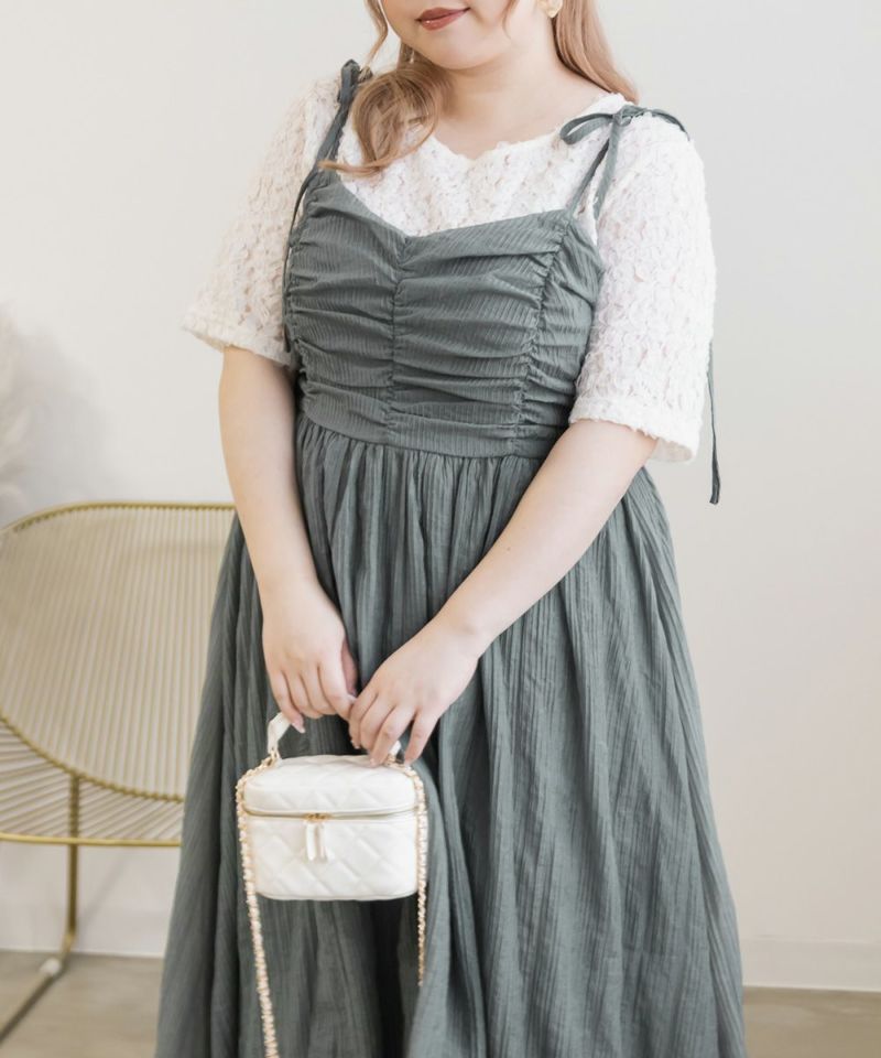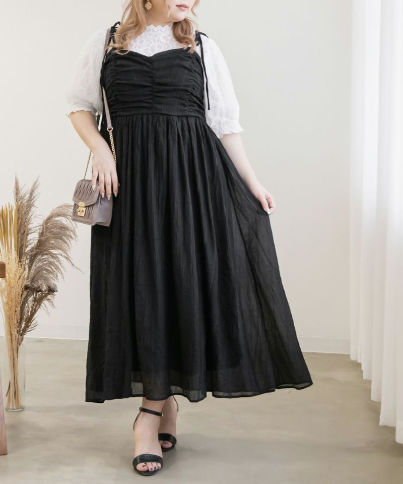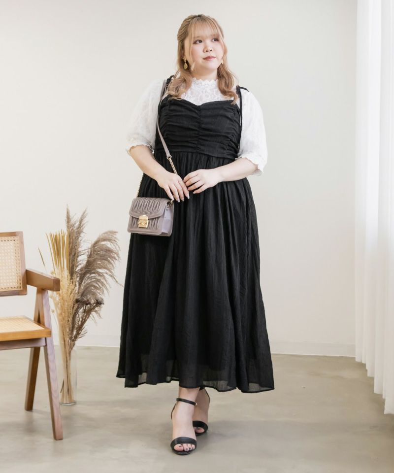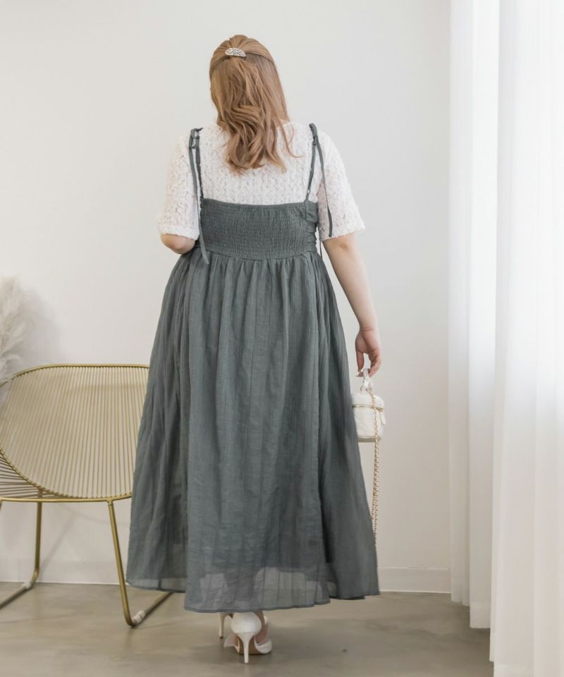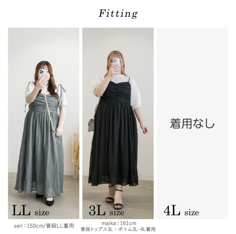 3Lを着てちょうどいいサイズでした。後ろシャーリングになっているから窮屈感なくらくちんな着心地です。シャーリングとギャザーのくしゅくしゅしたデザインで、お腹や腰回りのボディラインを気にせずに着ていられるのも嬉しいです!子供っぽくならずに上品な雰囲気のリボン付きで、取り外しもできるから、インナーにデザイン性がある時や、上からカーデを着るスタイルの時はとることができるのでとっても便利です◎表地は透け感と凹凸感がおしゃれな雰囲気で、真冬以外のロングシーズン使えそうです!とにかくシルエットが綺麗なので、キャミワンピで悩んでる方に是非お勧めしたい1枚です♪