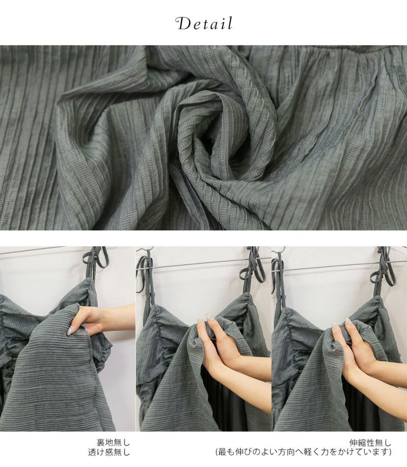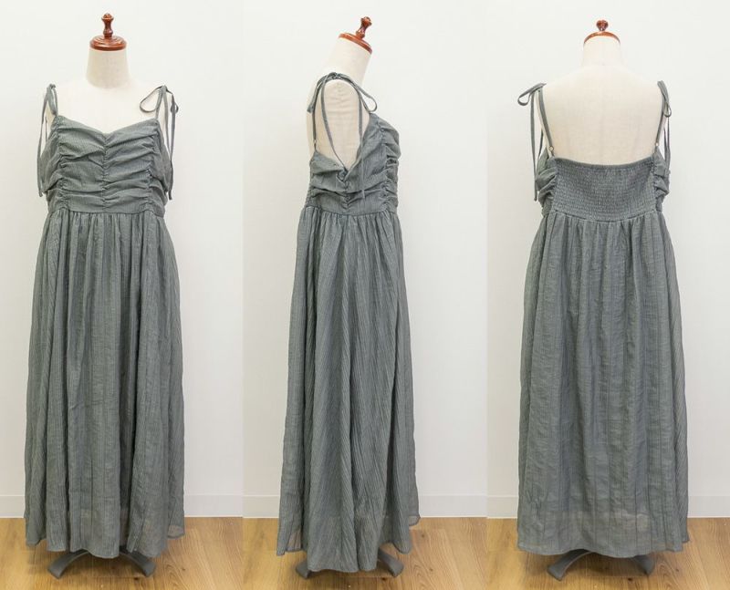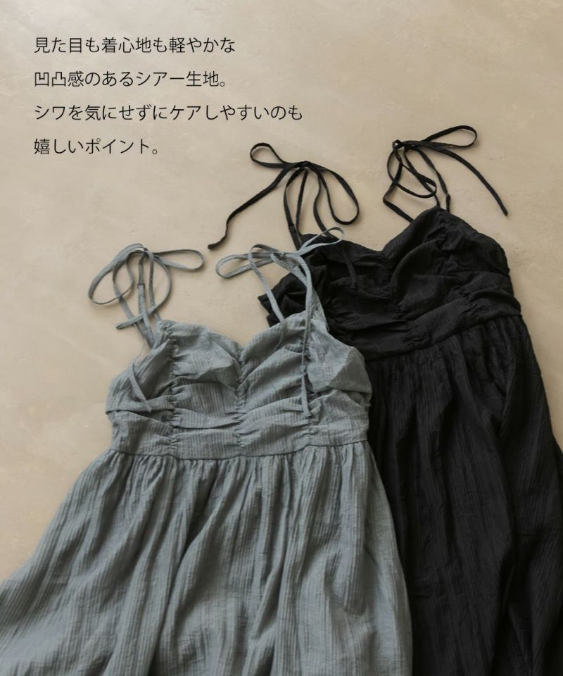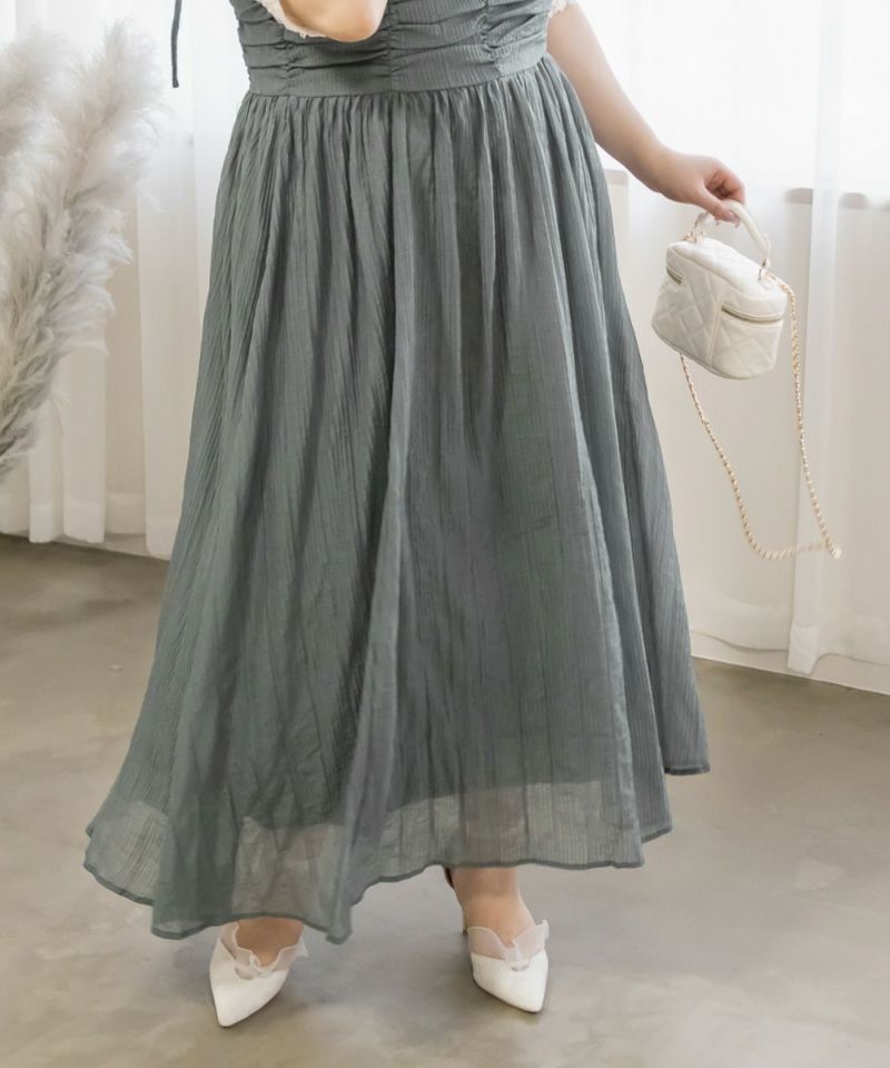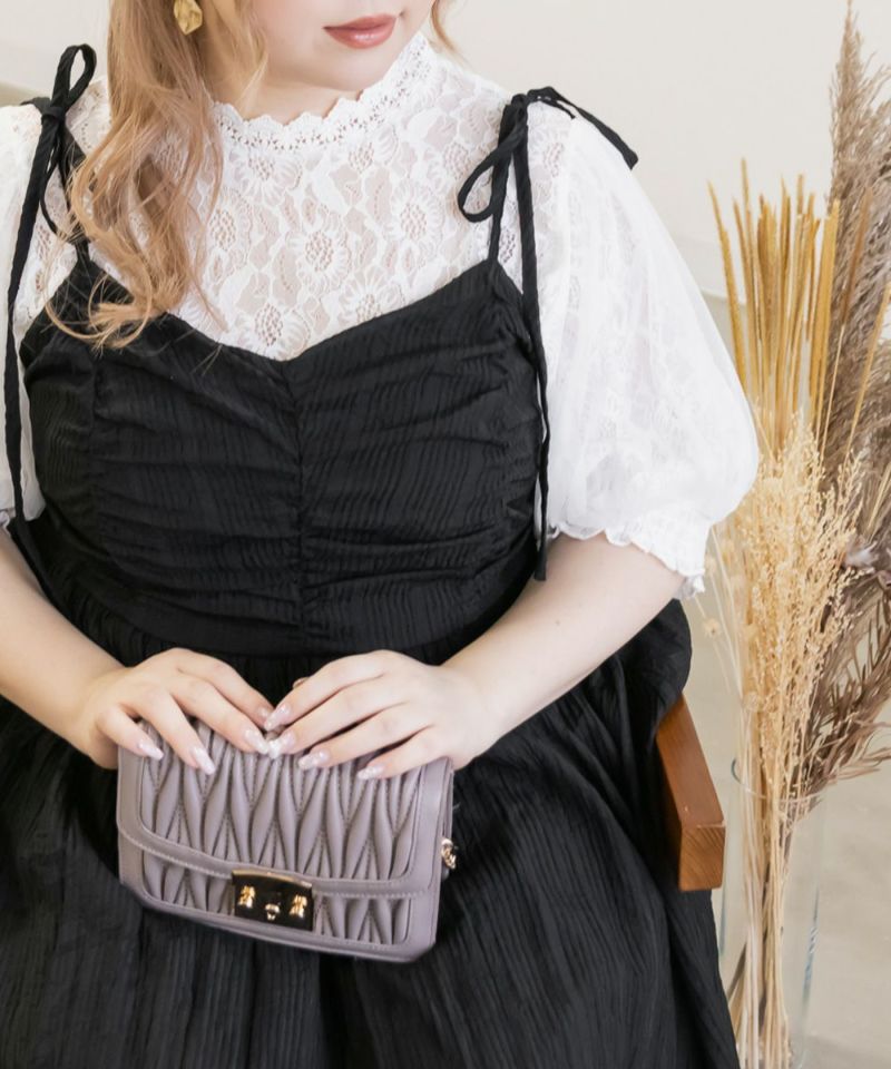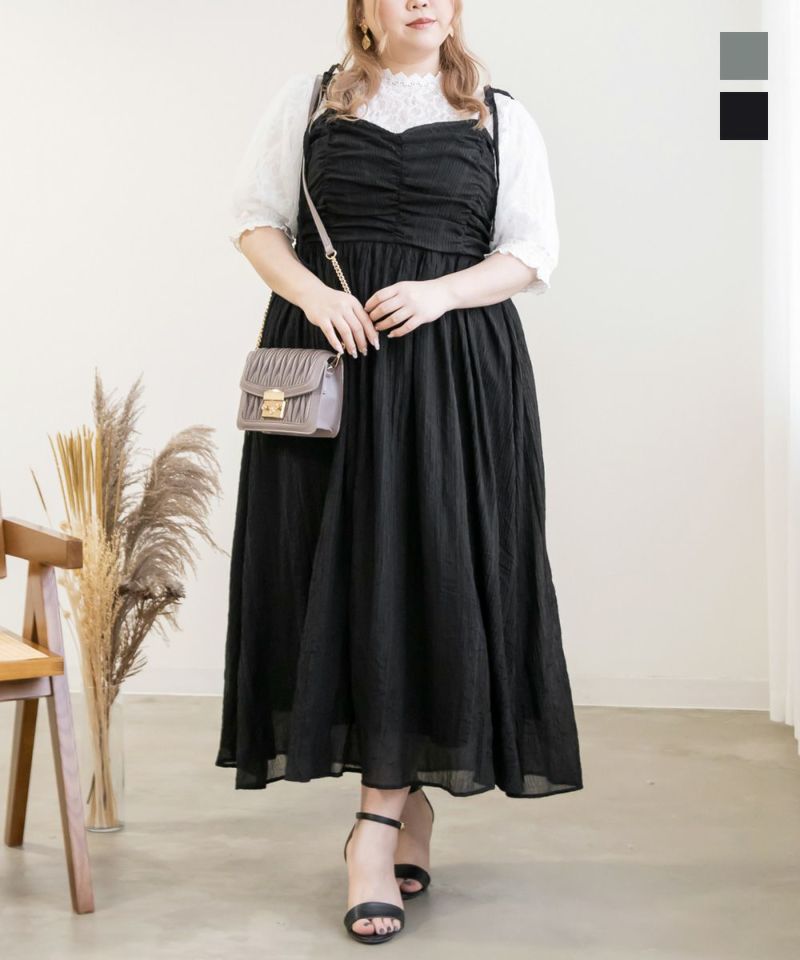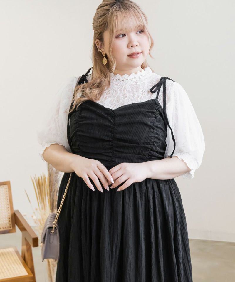 3Lを着てちょうどいいサイズでした。後ろシャーリングになっているから窮屈感なくらくちんな着心地です。シャーリングとギャザーのくしゅくしゅしたデザインで、お腹や腰回りのボディラインを気にせずに着ていられるのも嬉しいです!子供っぽくならずに上品な雰囲気のリボン付きで、取り外しもできるから、インナーにデザイン性がある時や、上からカーデを着るスタイルの時はとることができるのでとっても便利です◎表地は透け感と凹凸感がおしゃれな雰囲気で、真冬以外のロングシーズン使えそうです!とにかくシルエットが綺麗なので、キャミワンピで悩んでる方に是非お勧めしたい1枚です♪