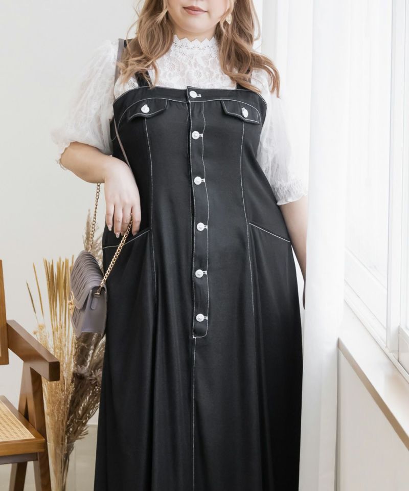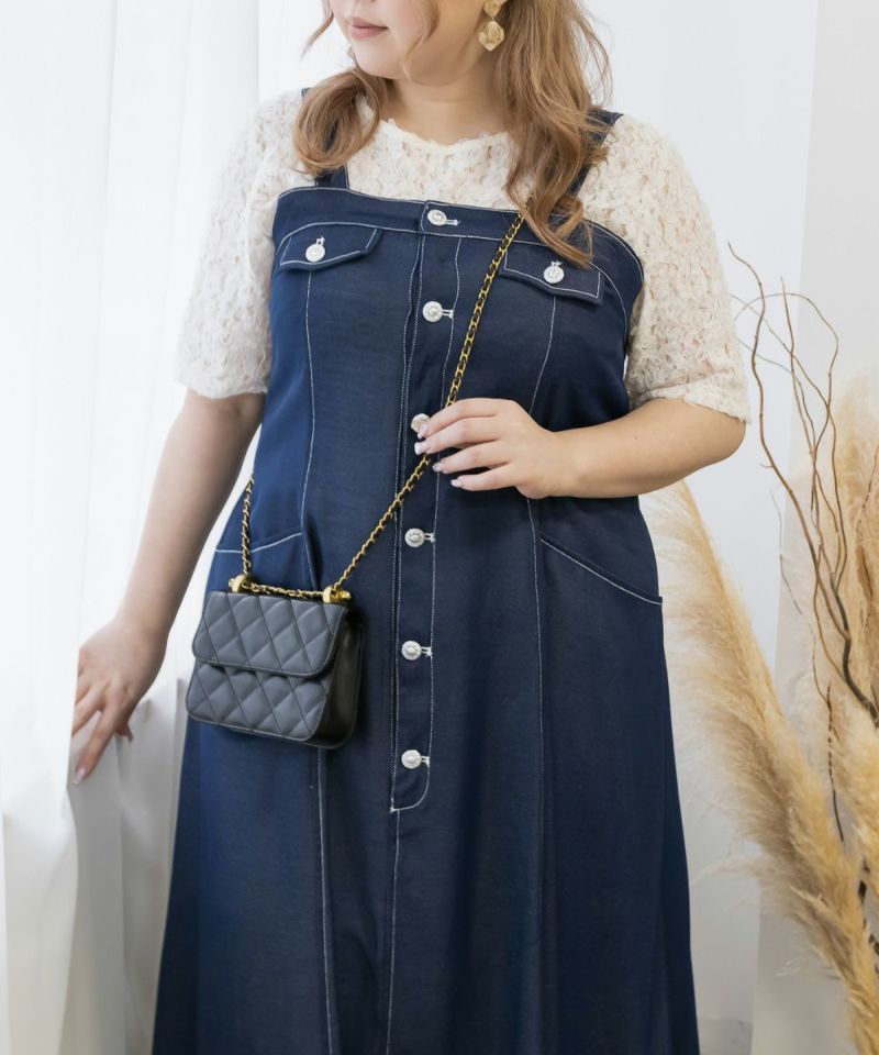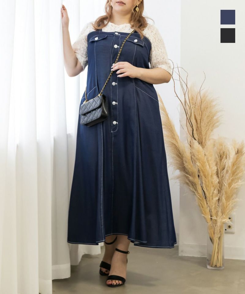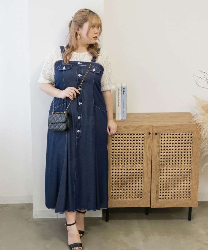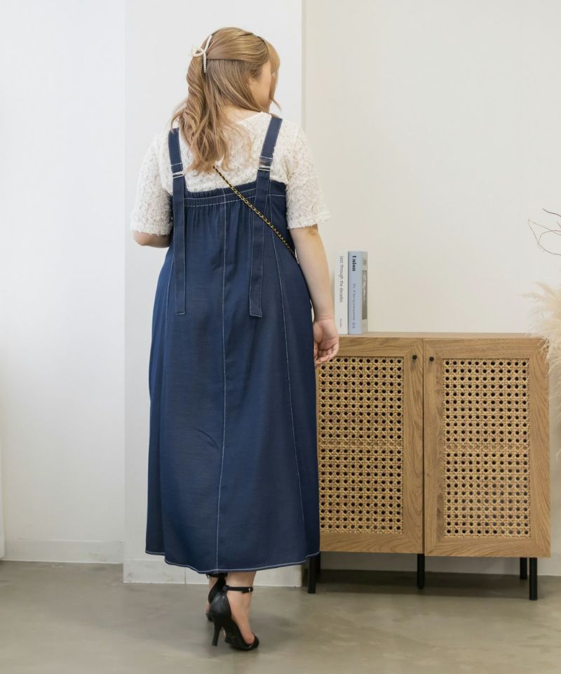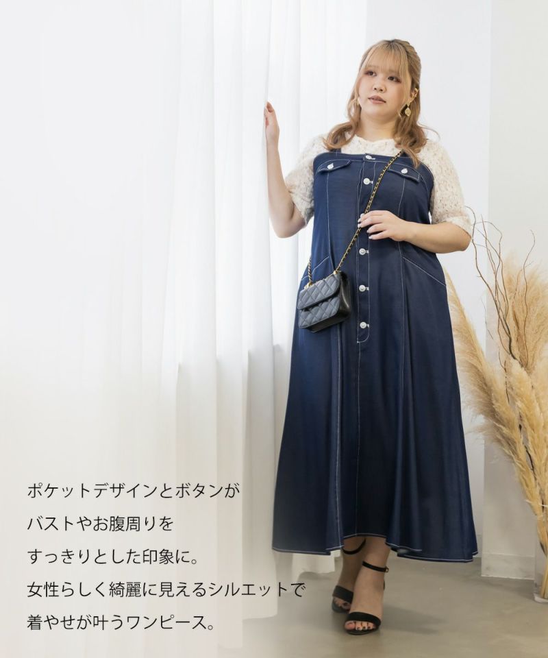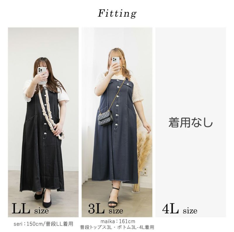 3Lを着てみてちょうどいいサイズでした。バストは窮屈感がないけれどすっきりとした見え方になれます!お腹周りはボタンやポケット、配色ステッチになった切替があることで目立たずにカバーされました!Aラインに広がる綺麗なシルエットで着やせができます。後ろ姿も肩紐が垂れていて可愛いので、どこから見られても華奢見えできるワンピースです♪季節問わず使えるデニム風の生地で、カジュアルにならずに綺麗めな雰囲気になれます!