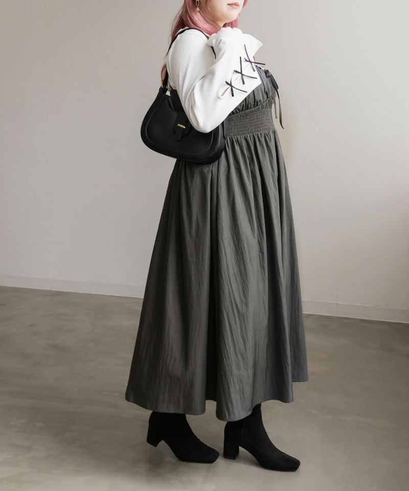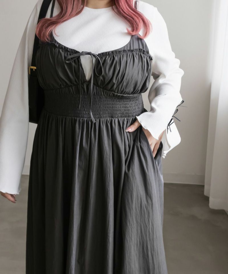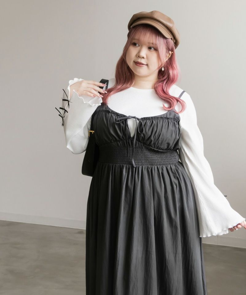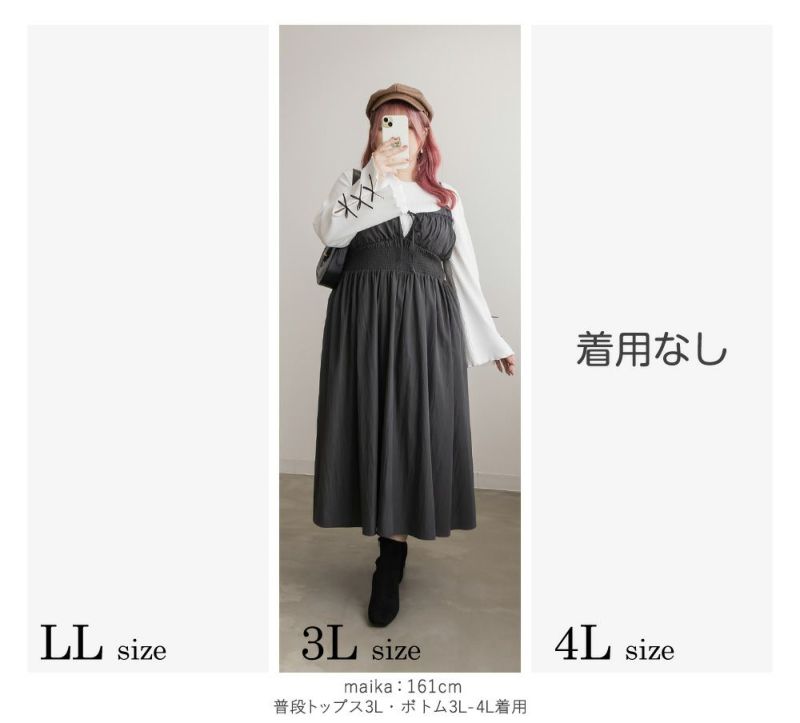 3Lを着てちょうどいいサイズ感でした!上半身はリボンとギャザーがたっぷりあしらわれていて可愛い!胸下の切替が斜めに入っていてコンパクトに見えるのがポイント!ウエスト部分と背中が全面シャーリングゴムになっていてとっても楽ちんで、後ろ姿もすっきりして見えます◎ウエストからフレアに広がるので、お腹やお尻も綺麗に隠して着やせできるワンピースです♪季節関係なく使える軽い生地なのでコンパクトになり旅行にもおすすめです!季節問わず使えてインナーを変えて色々なコーディネートに着回しできます!