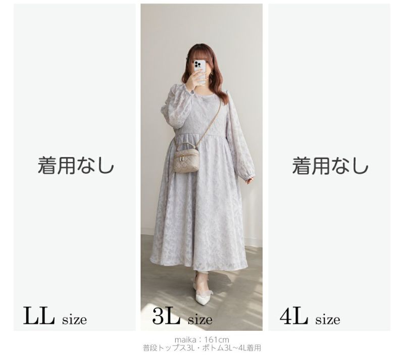 3Lを着てちょうどいいサイズでした!シンプルなデザインだけど透け感のある花柄調の生地が可愛くて大人っぽく着ることができます。デコルテから袖が透け感があるデザインで女性らしいです。春夏も使えますが、秋冬にはこの上にさらっとカーディガンを羽織ったりしてレイヤードするのもお勧めです!かさばらないすっきりとしたデザインだから、ビスチェを上に合わせたりするのもトレンド感があって可愛いです◎上品な印象なので、二次会など、ちょっと綺麗めなシーンにも使えちゃいます!