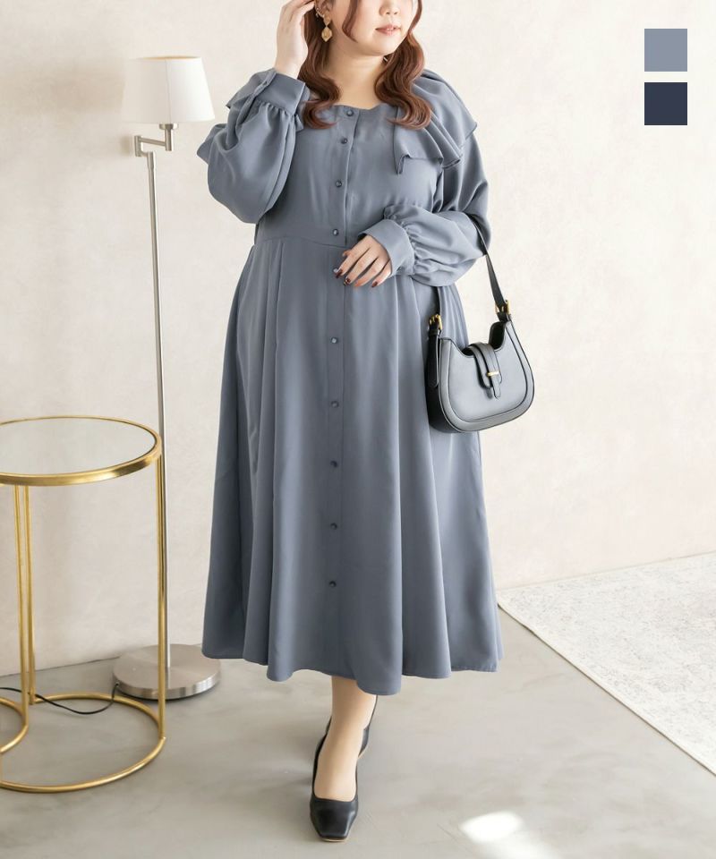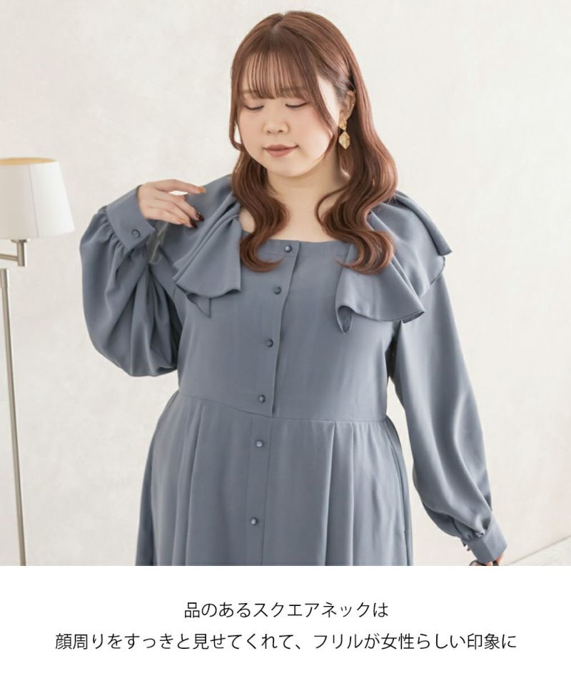 3Lを着て丁度いいサイズでした。さらりとした肌触りで真夏以外のロングシーズン着られる生地です。スクエアネックとフリルが顔回りがとてもすっきり華奢に見えました◎フェミニンさもたっぷりで、ネックレスなども映えて可愛いです♪さらっと1枚で着映えするワンピースです!