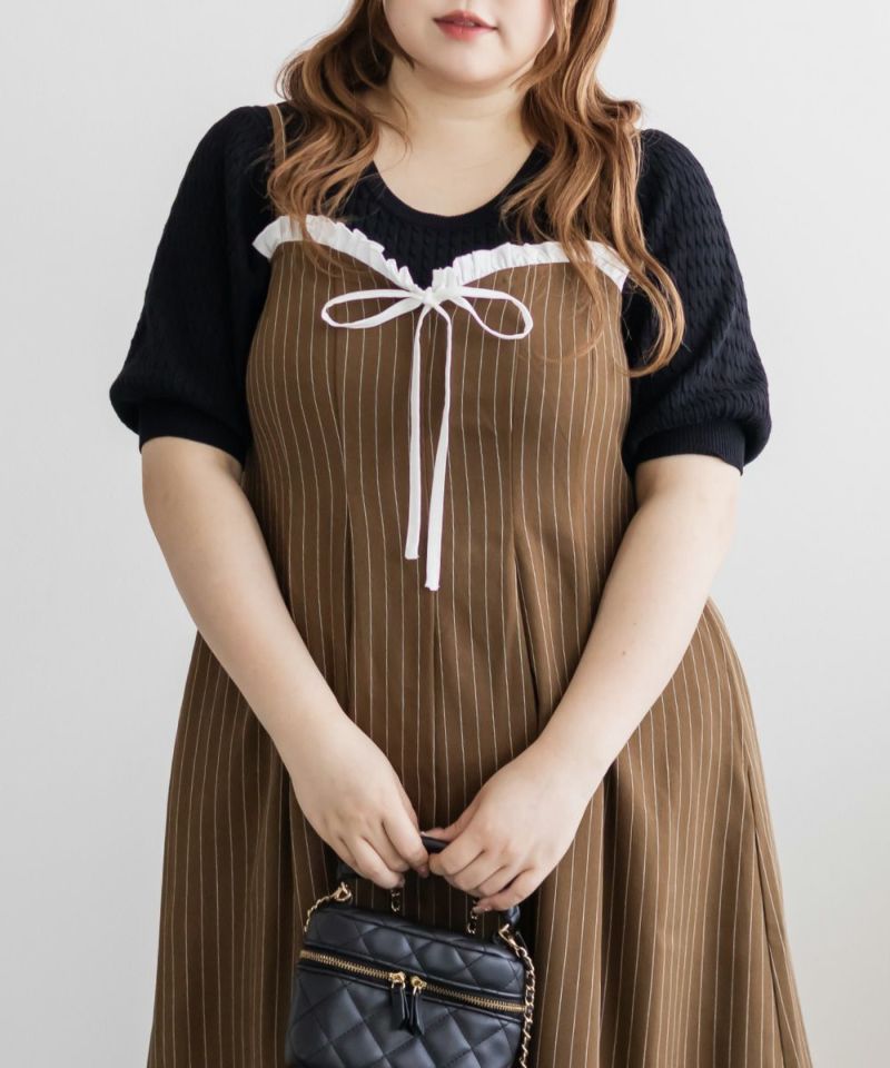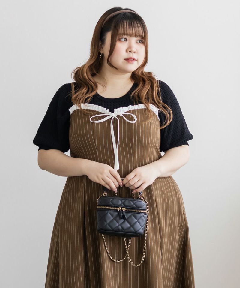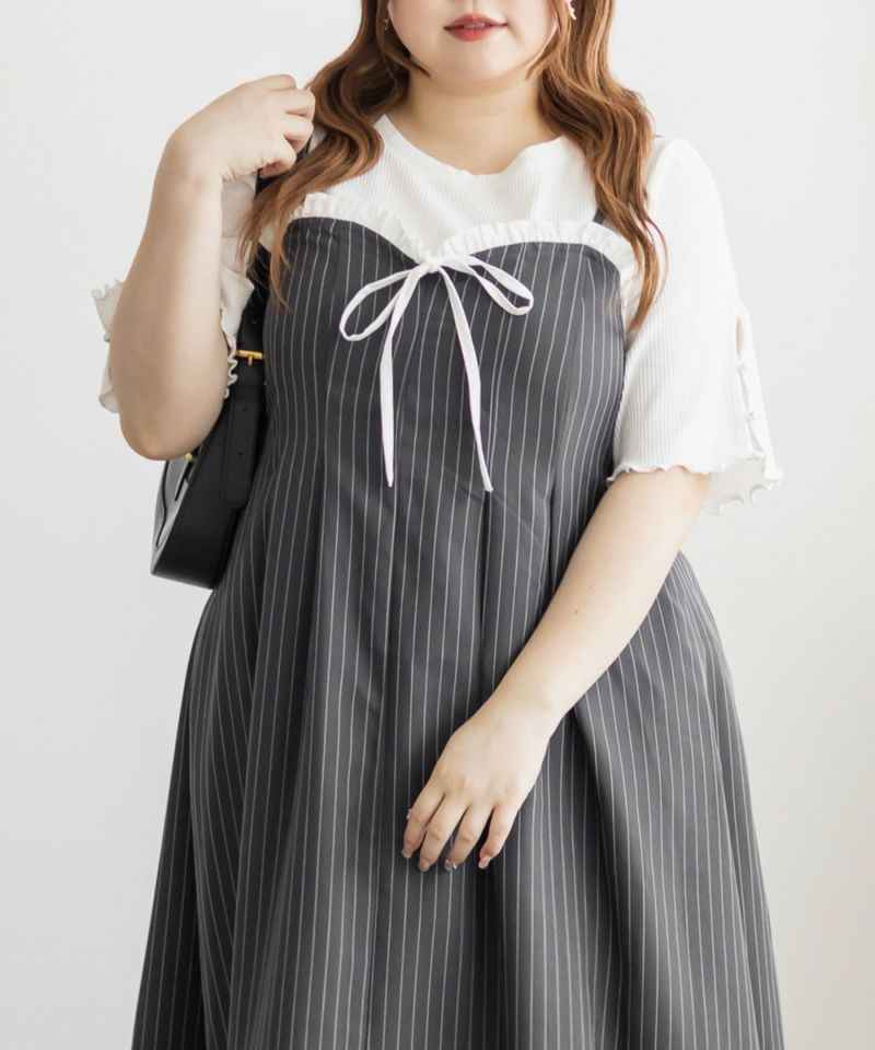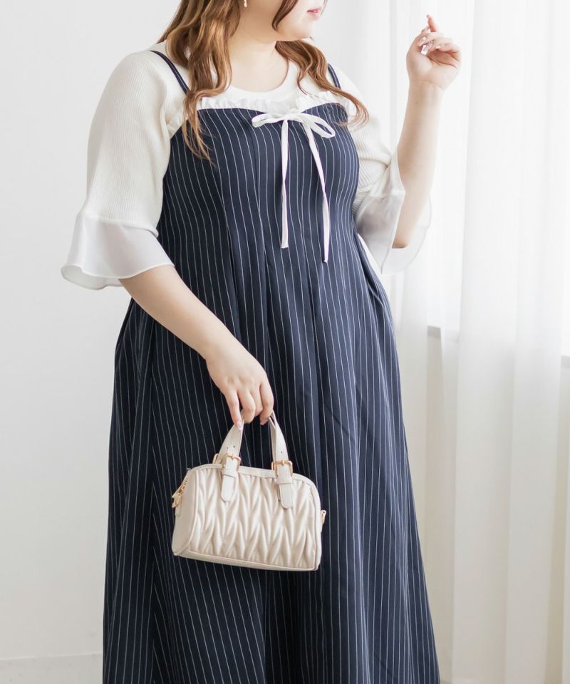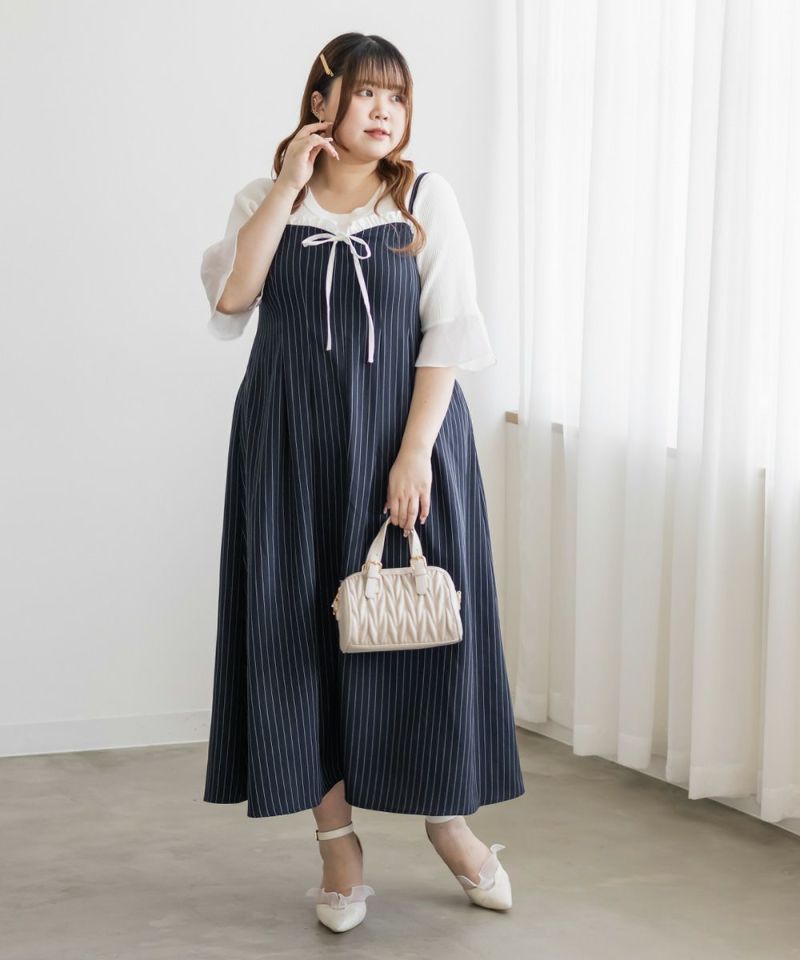 3Lを着て、見頃なども丁度良くすっきり綺麗に着用出来ました。後ろはゴムなので、フィット感がありながら窮屈感はなかったです!ウエスト部分にタックがたっぷり入っていてお腹周りもすっきりカバーしてくれます!すらっとしたシルエットながら、しっかりボディラインをカバーしてくれるディティールでした。ストライプ×リボン×フリルのときめき要素が詰まったキャミワンピで、アジャスター付きで肩紐の長さを調整できるので、バスト位置もちょうどよく着られました。Tシャツやブラウスを合わせて甘めに、シンプルなトップスでカジュアルに、着回し力も抜群の一枚です◎