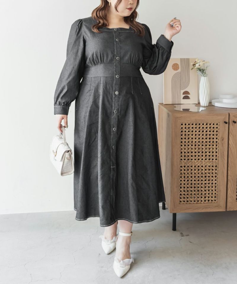 3Lサイズを着用て丁度いいサイズ感でした。スクエアネックなので、デコルテを綺麗に魅せてくれます!背中側はあまり開いてないのも嬉しいポイントです◎フロントは大きめのボタンがついているのと配色ステッチでメリハリのあるすっきりとした印象です!1枚でコーデが完成する主役級ワンピースで、丈感もしっかりありいろいろなシーンで着られるのが嬉しいです!上品で大人っぽいデザインなので、お出かけはもちろん、ちょっときっちりしたいシーンなどでも活躍できそうです!