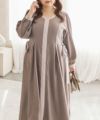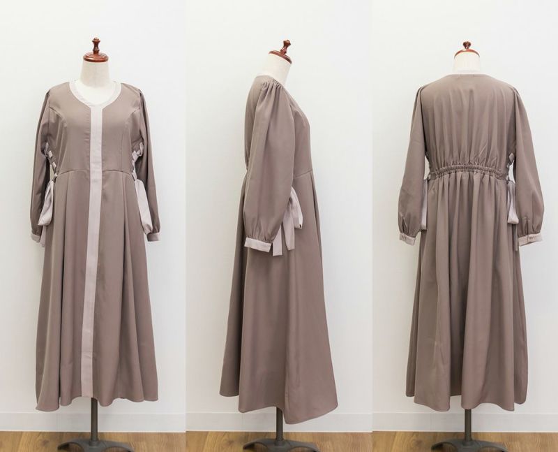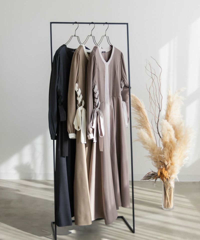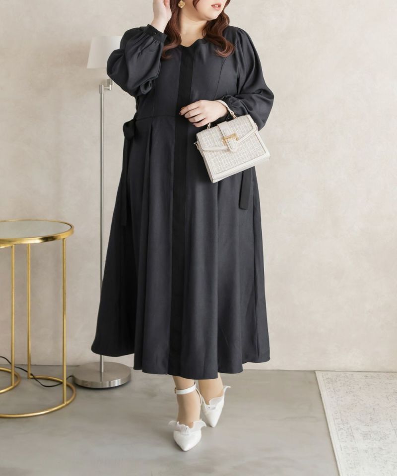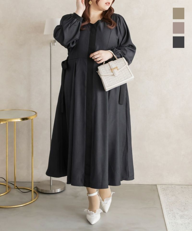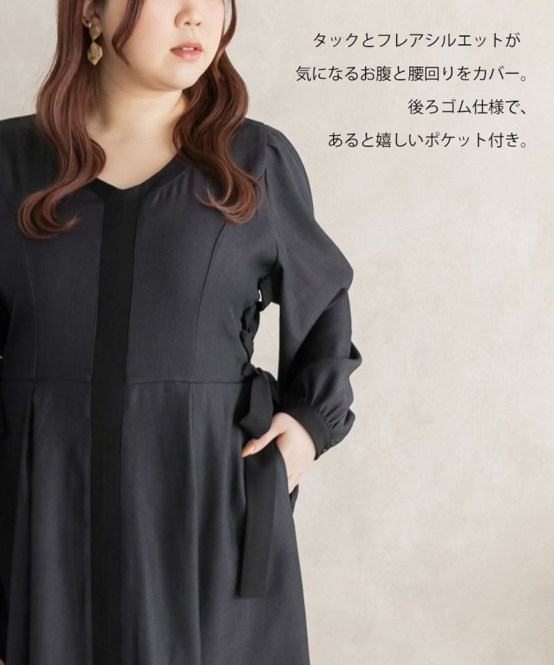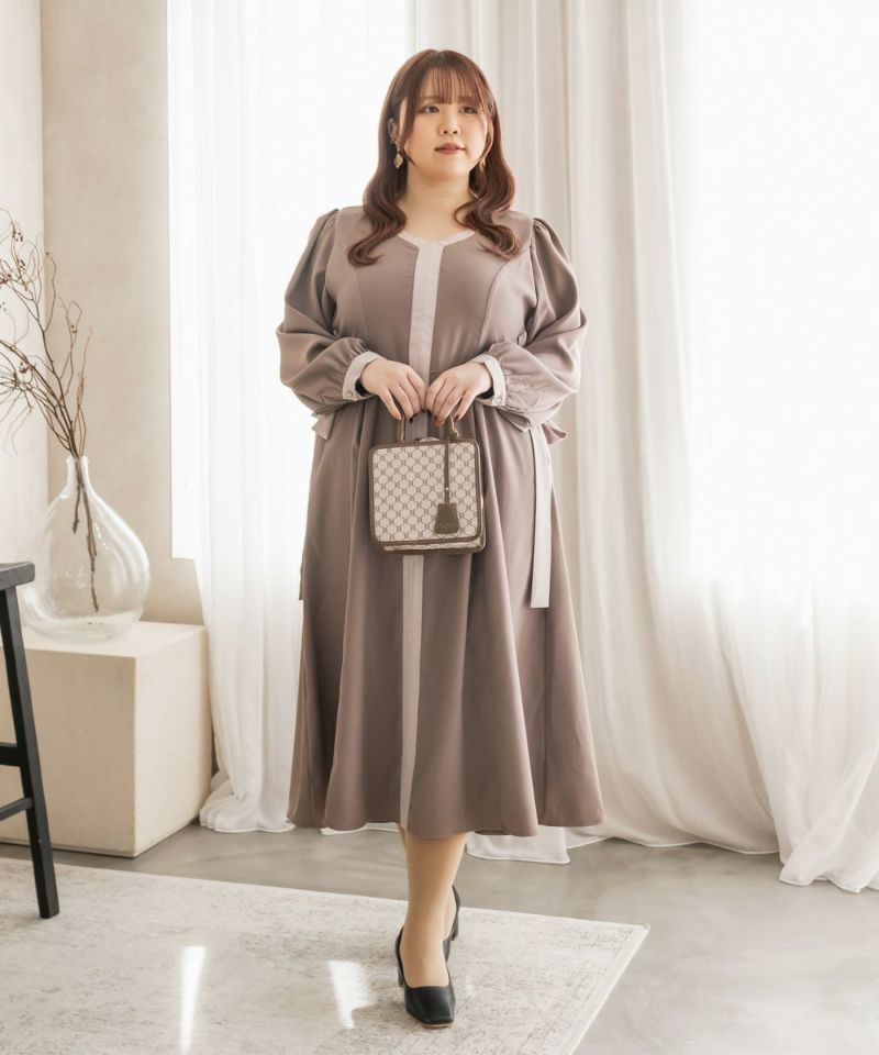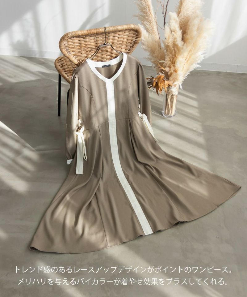 3Lサイズを着用しましたが、丁度良いサイズ感で、いつも通りのサイズ選びで問題なさそうです。ネックをすっきり開いているので着脱は問題なさそう♪デコルテをきれいで華奢見えしてくれるネックラインです!何より配色の切替がメリハリがあって視覚効果抜群で華奢に見える計算されたデザインがポイント!サイドのレースアップも抜け感がある印象で可愛いけど大人っぽいワンピースです◎たっぷり広がるフレアシルエットとさらっとした生地が揺れ感を出してくれ、1枚で完結する上品な1枚です!