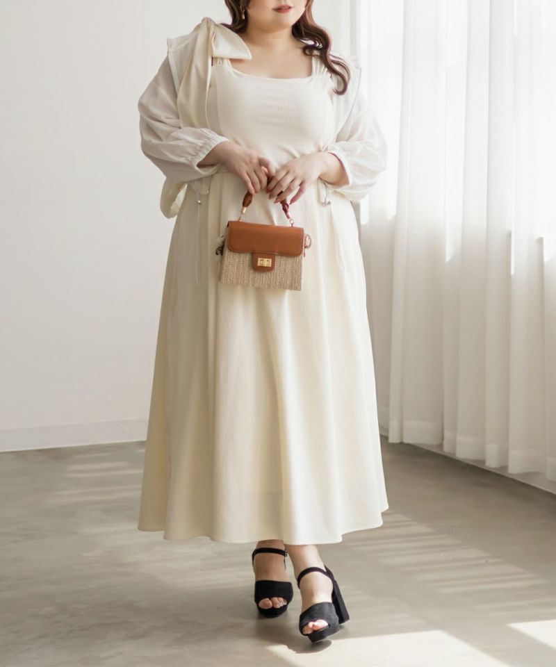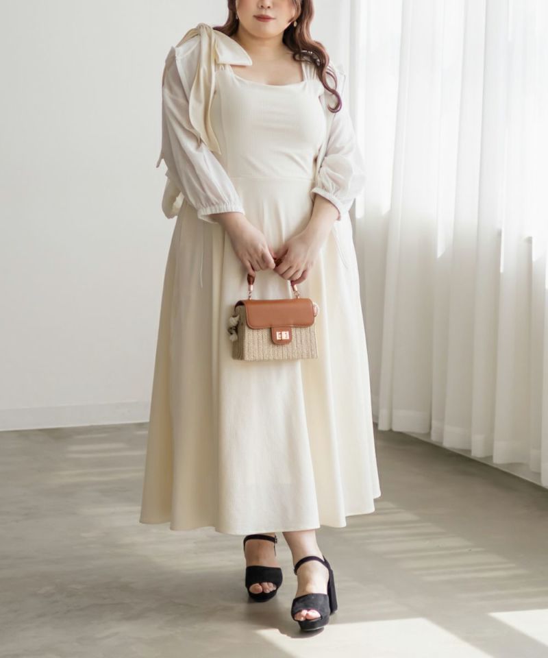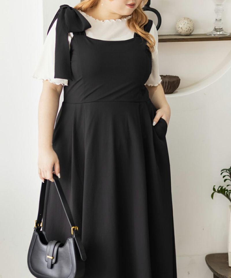 3Lサイズを着用しましたが、肩まわりやバストまわりも窮屈感なく、全体的にちょうどいいサイズ感でした◎生地に少しハリがあって、体のラインを拾いにくいのが嬉しいです!しっかり伸びもあるのでらくちんな着心地でした。肩のリボンがアクセントになっていて、甘くなりすぎず、さりげなく可愛さをプラスしてくれます。ノースリーブでも着用できるよう肩紐が隠せるデザインになっているのがポイントで、インナー次第でロングシーズン使えてたくさんの着回しが可能です♪
