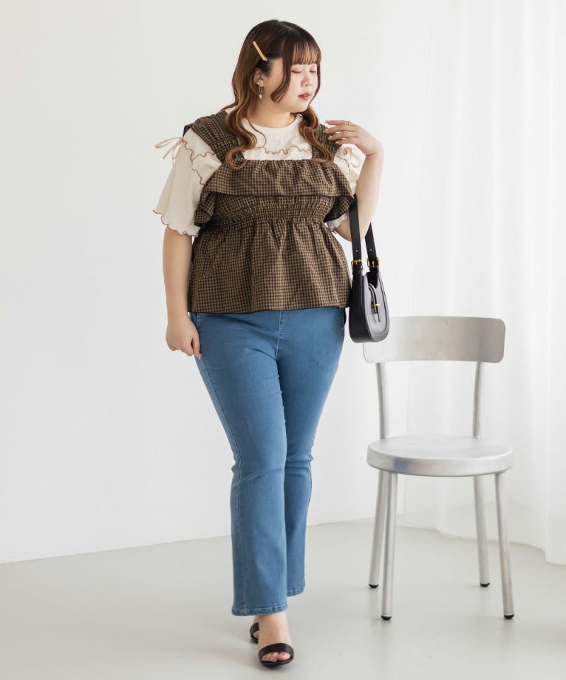 3Lサイズを着用して、窮屈感なく程よく体にフィットしました!シャーリングゴム仕様でラクに着られて、しっかりくびれを作ってくれるシルエットが嬉しいポイントです♪存在感たっぷりのフリルとギンガムチェックが甘さを引き立てて、シンプルなTシャツやブラウスと合わせるだけで主役級の着こなしになります!タンクトップとして着るのも可愛いと思います◎重ね着したりしてオールシーズン着られるので、あるとスタイリングの幅が広がるアイテムです!