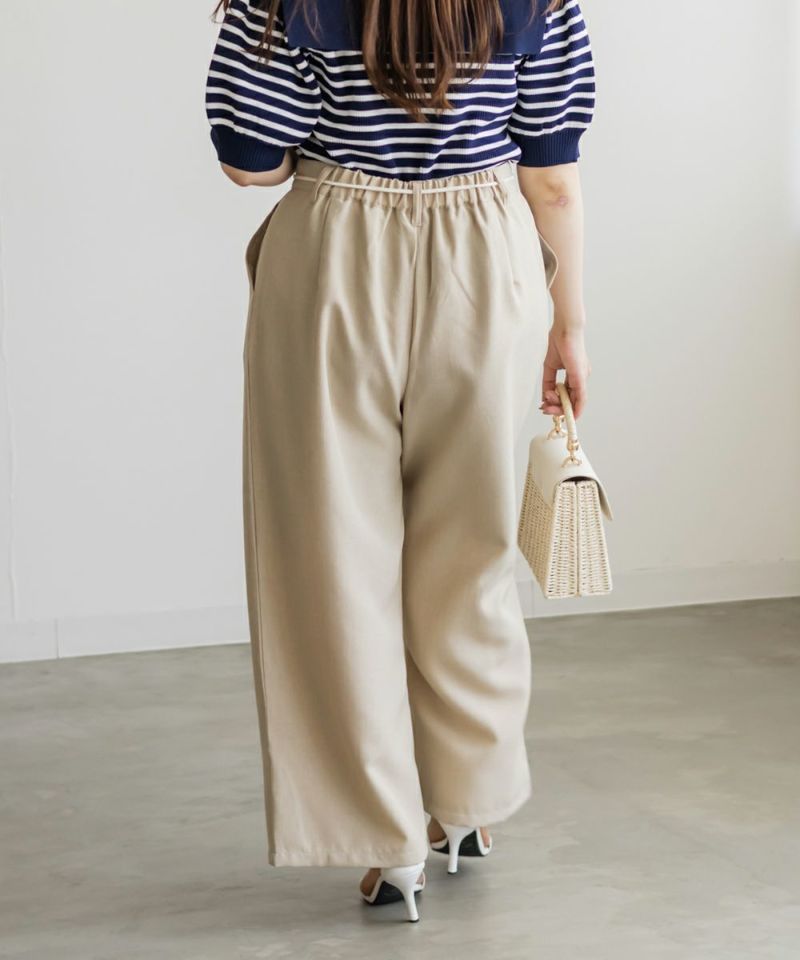 3Lサイズで腰まわりや太ももにも少しゆとりがあり、セミワイドパンツくらいのシルエットで動きやすさもばっちりでした。さらっと軽やかなリネンライク素材で、夏でも快適に過ごせる履き心地◎脚のラインを拾わず、自然に体型カバーしてくれます♪ウエストは後ろゴム仕様で楽ちん!さらにフロントのリボンデザインがコーデのアクセントになってくれて、トップスをインしてもバランスよく着こなせました!