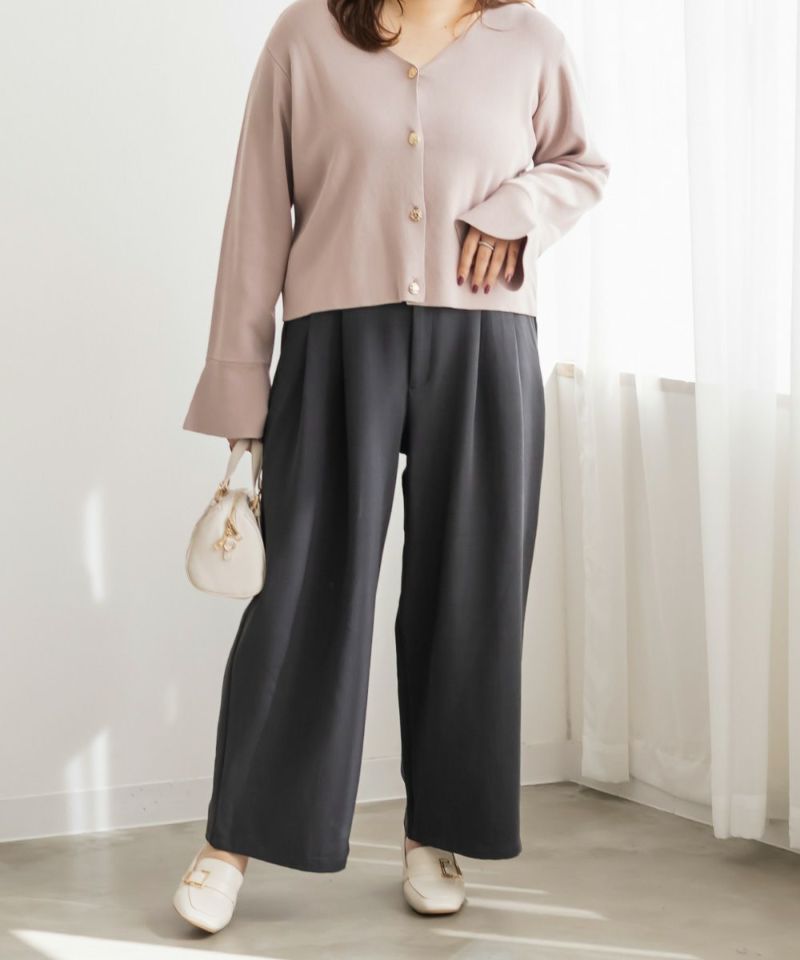 3Lサイズを着用してちょうどいいサイズ感でした。いつも通りのサイズ選びで問題なさそうです。ゆとりがありつつすっきり見えるシルエットで、楽ちんな着心地です!どんなトップスとも相性良く着られて、コーデに困らないのが嬉しいです◎ウエスト部分にベルトが付いたデザインで、短丈のアイテムと合わせたときにポイントになります!普段使いはもちろん、お仕事にもおすすめでオールシーズン使える便利な1枚です!
