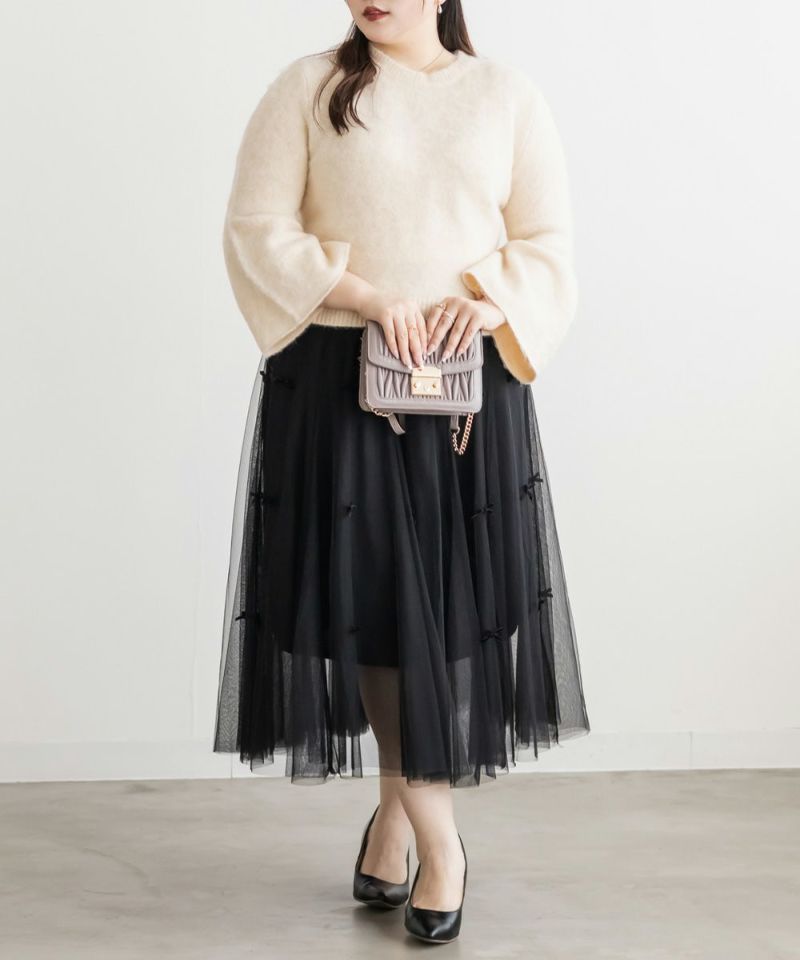 3Lを着てちょうどいいサイズ感でした。ウエストはゴムになっていて着心地ラクチン◎ひらひら軽い着心地のチュールにリボンあしらわれていて、ガーリーな1枚です♪フレアシルエットで広がりすぎないのでトップスを選ばずにすっきりと着用出来ます!オールシーズン着られるのでデートやお出かけにたくさん着回ししたいスカートです。