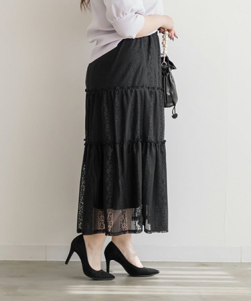 3Lサイズを着てちょうどいい着心地でした。ウエストはゴムで窮屈感も無く、フレアシルエットなので身体のラインも拾わず足さばきもしやすかったです!トレンドのレースアイテムで、今っぽい着こなしにお勧めの1枚!ティアードデザインが華やかさを引き立てるて、軽やかな印象で女性らしさをプラスしてくれるアイテムです♪ふんわりとしたシルエットが特徴的で、動きが出るたびに美しく揺れます♪カジュアルなトップスと合わせても、レースが引き立ってエレガントな雰囲気に仕上がり、普段使いにもぴったりです◎