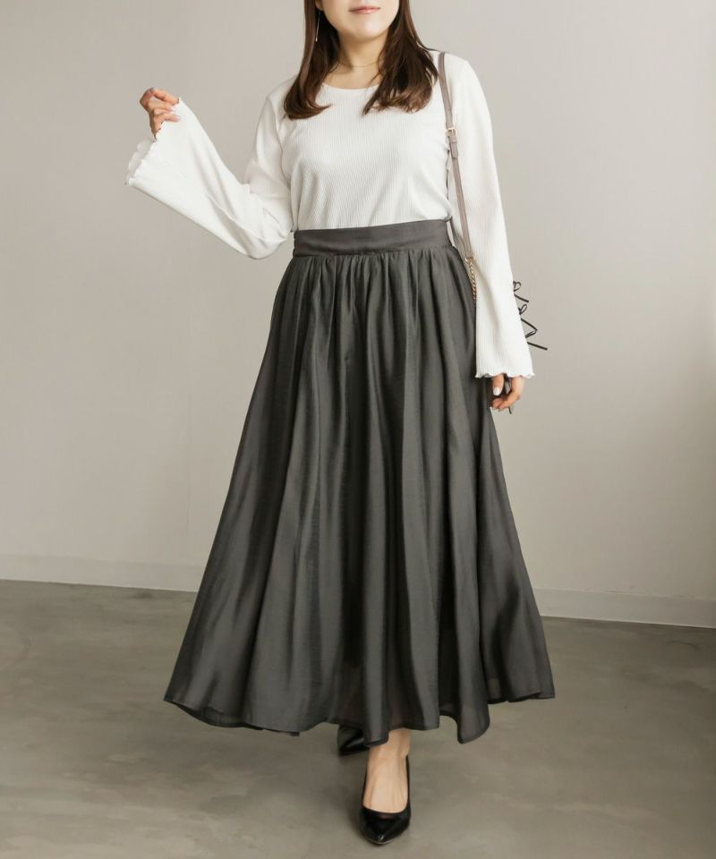 3Lサイズを着用して丁度いいサイズ感でした。後ろウエストは巾広めのゴムなので窮屈感のない着心地です◎たっぷりとしたギャザーがボディラインを拾わずに着られて綺麗なシルエットで着用出来ました。ウエストをキュッと見せてくれるフィット&フレアシルエットが歩くたびにゆれて女性らしいデザインです!さらりとした生地なのでオールシーズン大活躍します!
