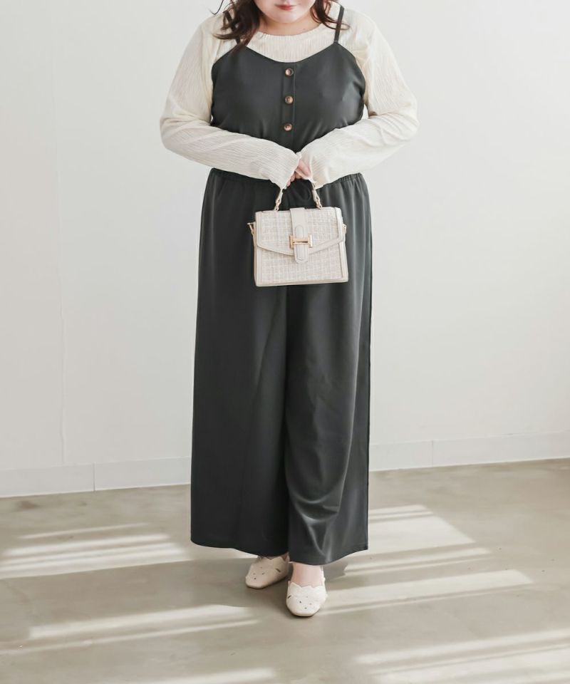 3Lサイズを着用して、ゆとりのあるサイズ感でした。3Lのサイズ感です。とってもらくちんなのに、すっきり細見えできるサロペットです!インナー次第でオールシーズン着用できる着心地で着回しがたくさんできそう◎さらっと着こなして大人っぽくこなれ感のある雰囲気になれる1枚です。