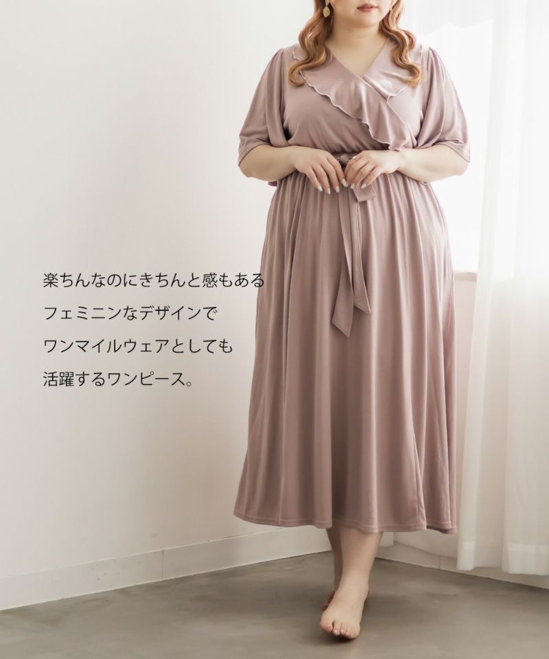 3Lサイズを着用して、全体的に程よいゆとりがあり、リラックスした着心地でした! 柔らかくて伸縮性のあるカットソー素材が、肌に馴染んでとても快適♪ ルームウェアとは思えないほどの可愛らしさで、フリルデザインやカシュクール風のシルエットがフェミニンな雰囲気を演出してくれます◎ ウエストゴム仕様で締め付け感がなく、ストレスフリーな着用感が嬉しいポイント! お家時間はもちろん、ワンマイルウェアとしても活躍してくれる万能ワンピースです!