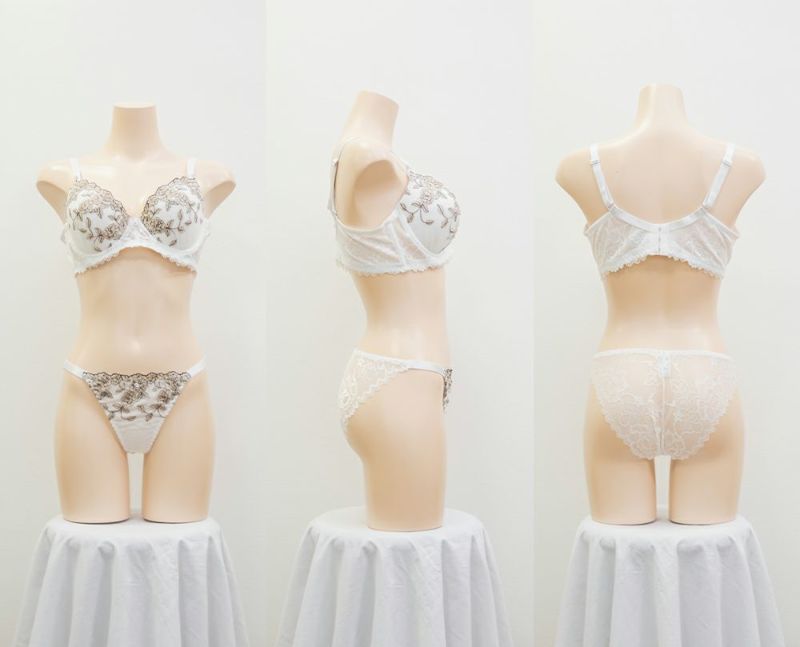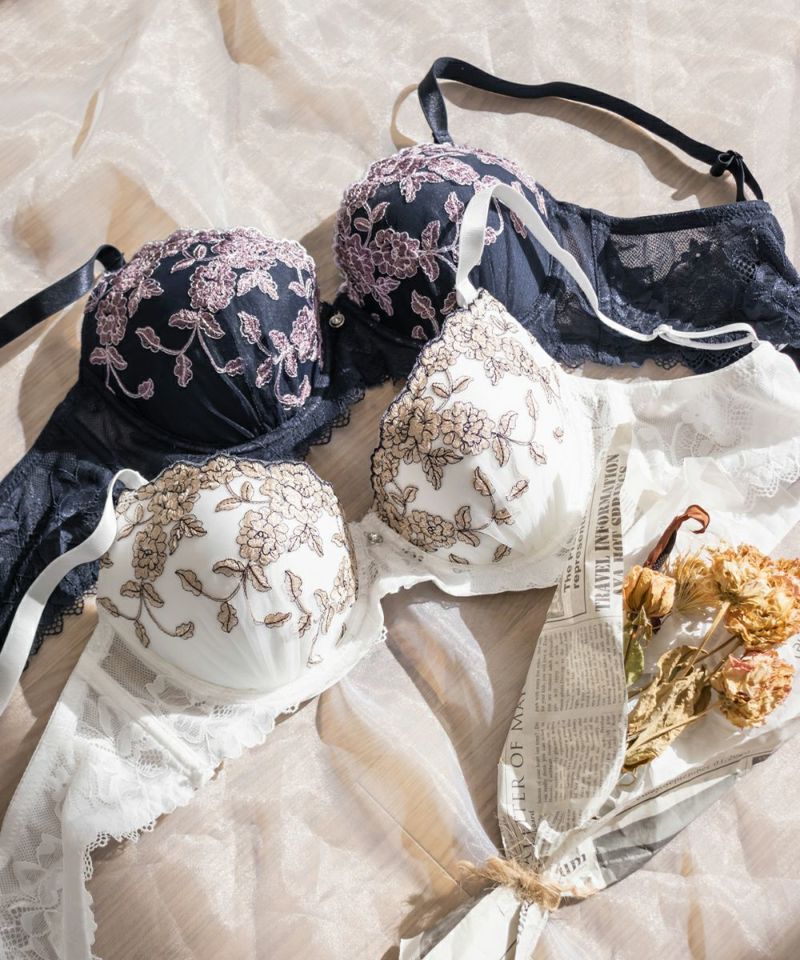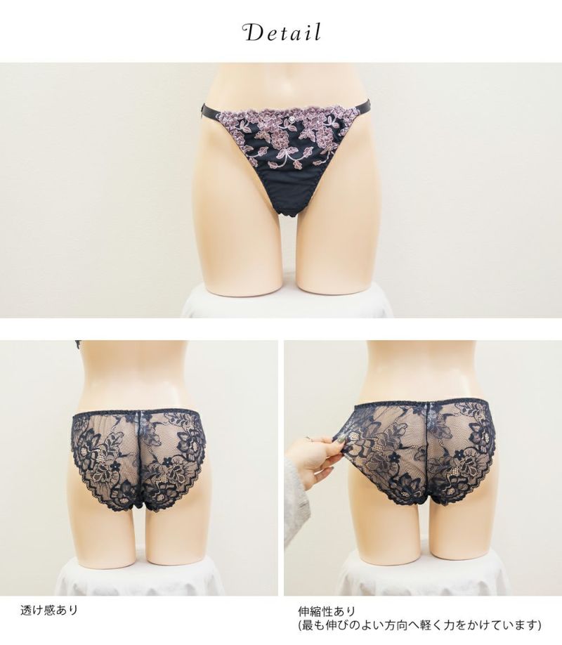 脇高フラワー刺繍レースブラジャー&ショーツセット
