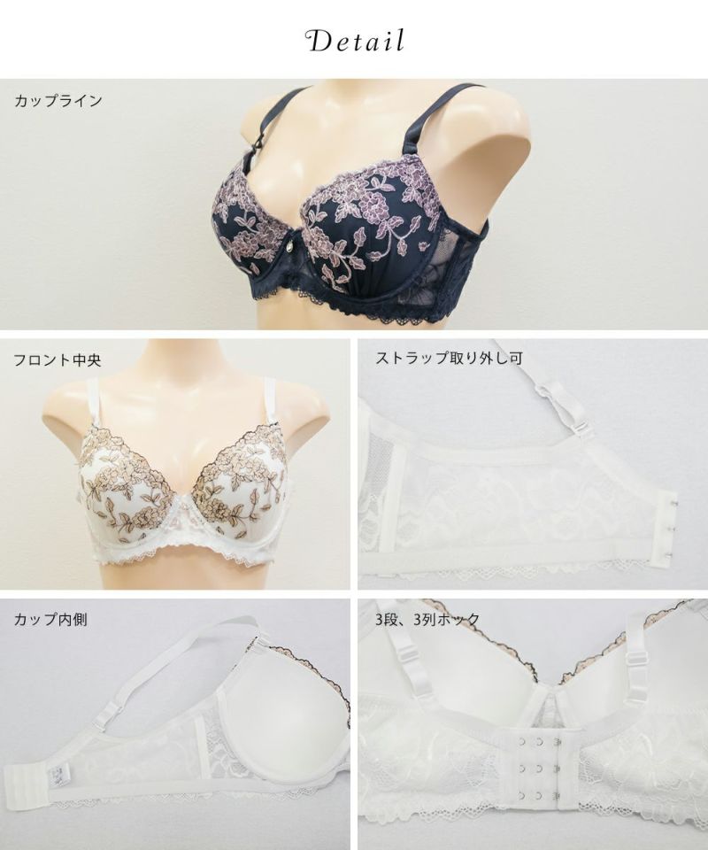 【カップタイプ】3/4カップ・モールドカップ(丸みを形成した厚みのあるカップです)、【ホックの数】3段3列、【パット付属】なし、【パットポケット】なし、【ストラップ取外し】可、【ワイヤー】あり、※タンブル乾燥禁止
