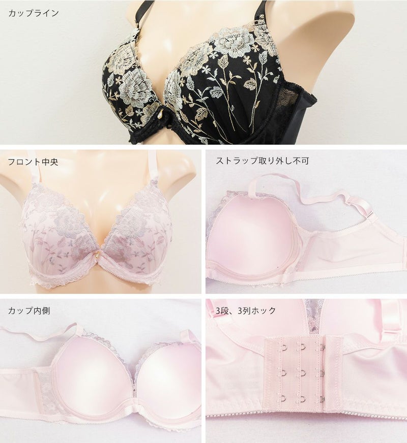【カップタイプ】3/4カップ・モールドカップ(丸みを形成した厚みのあるカップです)、【ホックの数】3段3列、【パット付属】なし、【パットポケット】なし、【ストラップ取外し】可、【ワイヤー】あり、※タンブル乾燥禁止 |