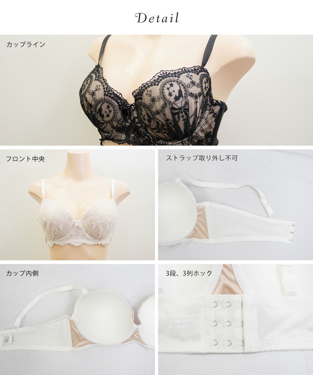 【カップタイプ】3/4カップ・モールドカップ(丸みを形成した厚みのあるカップです)、【ホックの数】3段3列、【パット付属】なし、【パットポケット】なし、【ストラップ取外し】不可、【ワイヤー】あり、※タンブル乾燥禁止