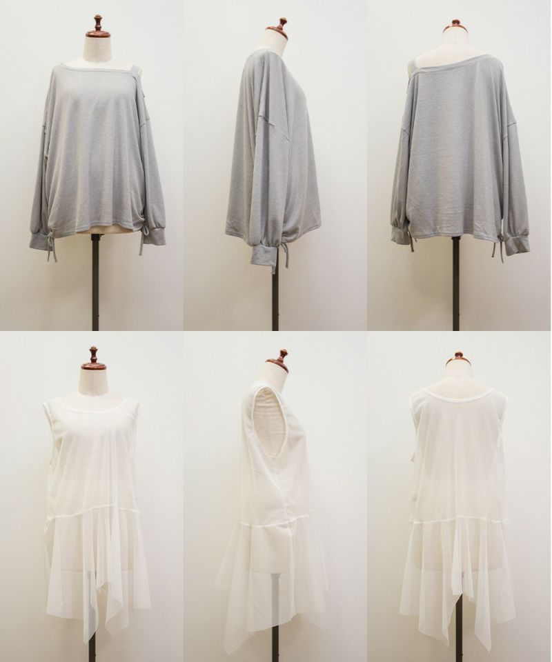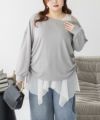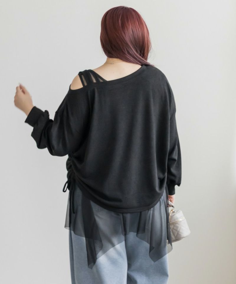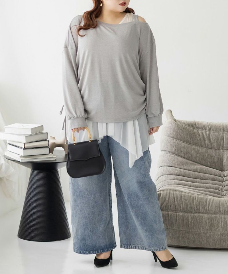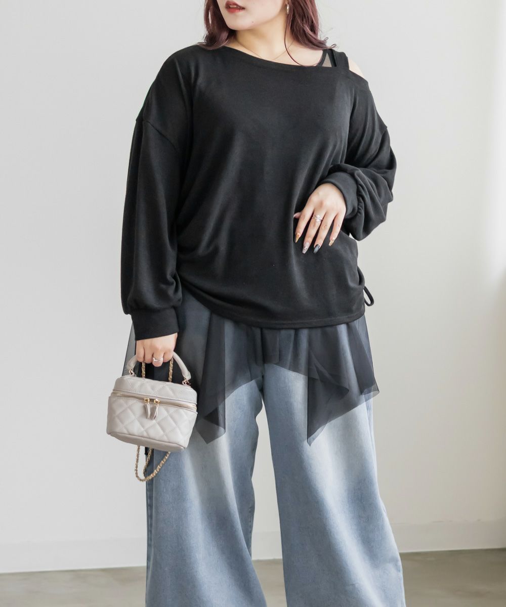 3Lサイズを着用しました!トップスはカットソー生地なのと、インナーはチュールで軽く少し伸びる生地なのでとってもラクな着心地です◎ トップスの両サイドはブラウジング出来て、リボン結びも可愛いし、お好きな丈感に少し調節できます!らくちんな着心地ですが、ワンショルデザインとレイヤードセットになっていて野暮ったくならず洗練された印象。インナーは程よく丈があるので下お腹周りも自然にカバーしてくれすっきり見えします!ラフなのに女っぽさ満点の1枚で、お出かけにぴったり!もちろんトップス・インナーは別で着回しできるので、色々なスタイリングが楽しめます♪