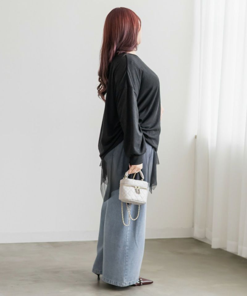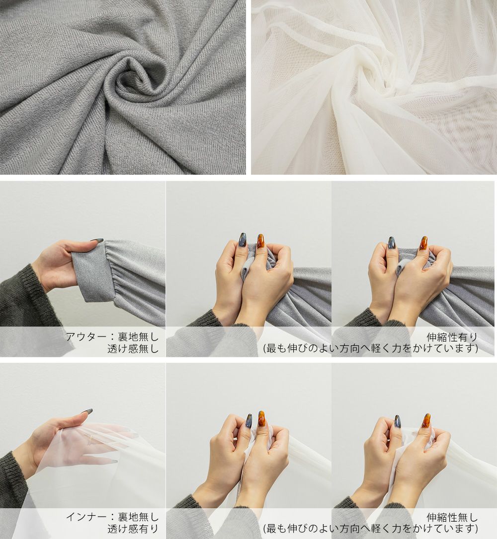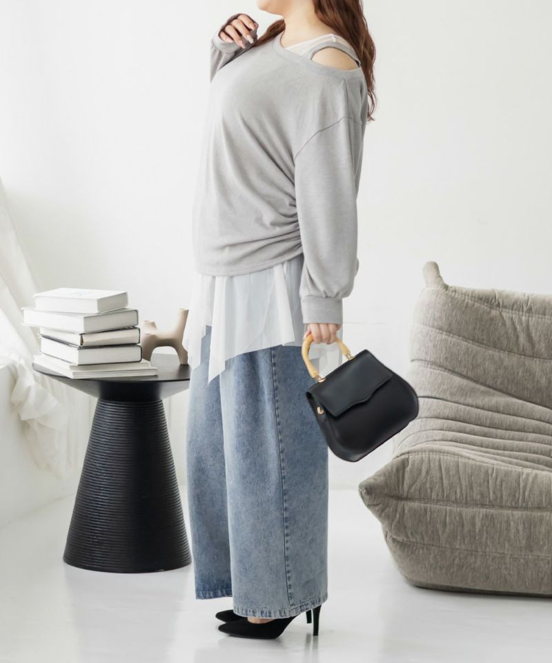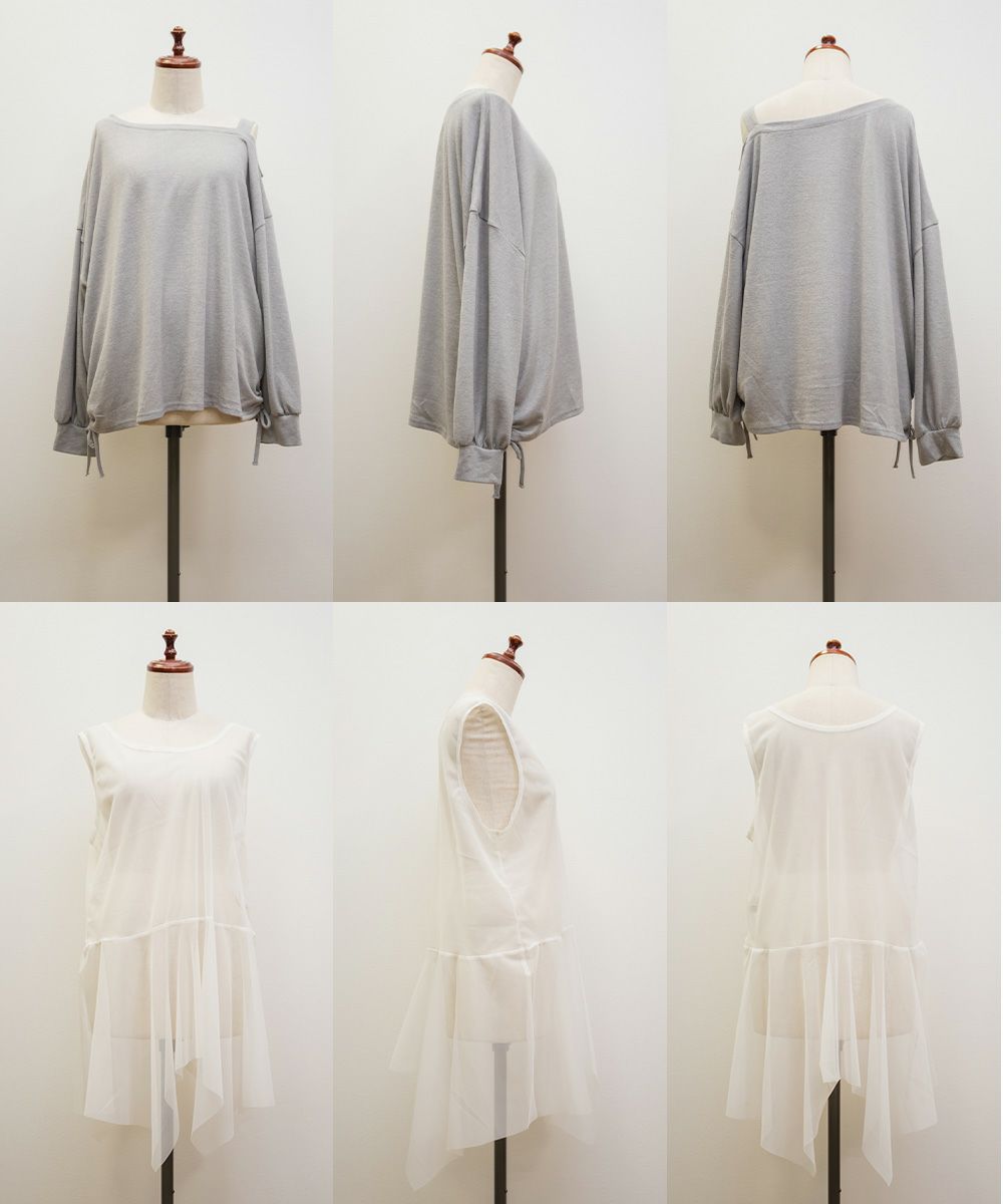 3Lサイズを着用しました!トップスはカットソー生地なのと、インナーはチュールで軽く少し伸びる生地なのでとってもラクな着心地です◎ トップスの両サイドはブラウジング出来て、リボン結びも可愛いし、お好きな丈感に少し調節できます!らくちんな着心地ですが、ワンショルデザインとレイヤードセットになっていて野暮ったくならず洗練された印象。インナーは程よく丈があるので下お腹周りも自然にカバーしてくれすっきり見えします!ラフなのに女っぽさ満点の1枚で、お出かけにぴったり!もちろんトップス・インナーは別で着回しできるので、色々なスタイリングが楽しめます♪