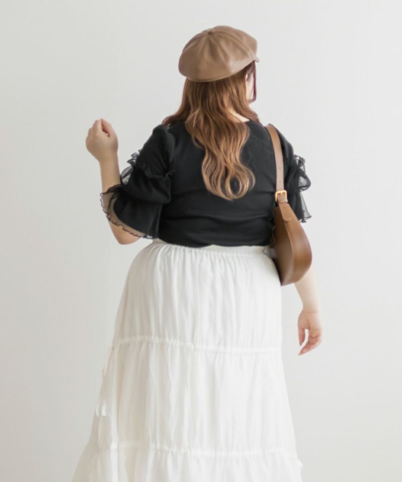 3Lサイズを着用しましたが、ちょうどいいフィット感で、リブ素材なので体に沿いながらも動きやすかったです!胸元のクロスチュールデザインがポイントになっていて、大人可愛い抜け感を演出してくれます♪生地はしっかり伸びるので、ストレスフリーな着心地でした。裾はインでもアウトでもバランスが取りやすい丈感で、パンツにもスカートにも合わせやすい万能トップスです!シンプルになりがちな夏のコーデに取り入れるだけで華やかになれるトップスです◎