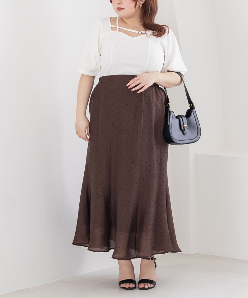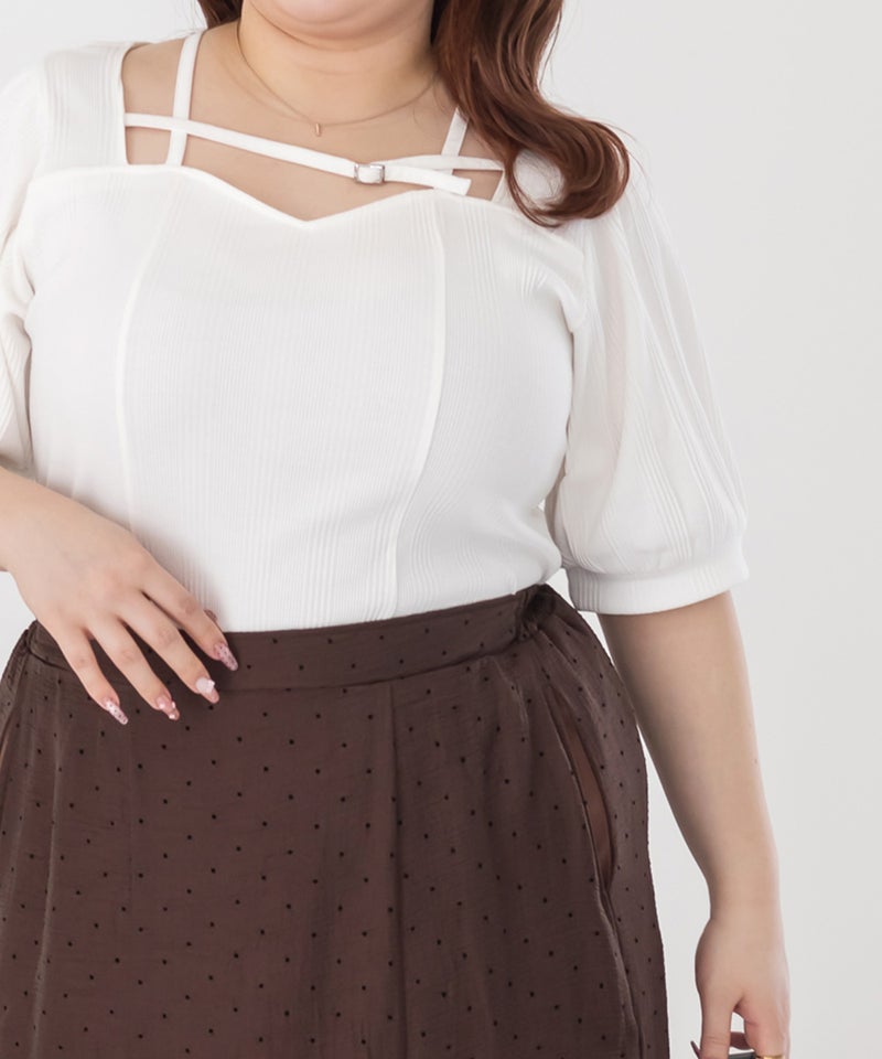 3Lサイズを着用しましたが、ぴったりちょうどいいサイズ感でした◎ピタッとなりすぎないのに、シルエットをきれいに見せてくれます。伸縮性のある生地で着心地もとてもよく、長時間着ていても窮屈さを感じませんでした。デコルテ部分のベルトデザインがアクセントになっていて、シンプルな中にさりげないおしゃれ感をプラスしてくれます!肌見せし過ぎないのにデコルテにデザインがあるだけで、しっかり抜け感を出してくれて、メリハリのあるすっきりとした印象になります◎ネックラインは程よい空き具合なので、真夏も涼しく着用出来ます!ネックレスいらずで大人っぽく着こなせるので、デートや普段のおでかけにもおすすめです!