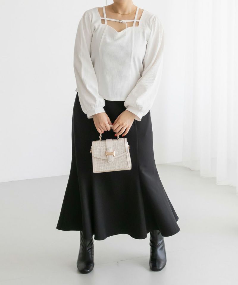 3Lサイズを着用しましたが、ちょうどいいサイズ感でした◎ピタッとなりすぎないのに、シルエットをきれいに見せてくれます。伸縮性のある生地で着心地もとてもよく、長時間着ていても窮屈さを感じませんでした。デコルテ部分のベルトデザインがアクセントになっていて、シンプルな中にさりげないおしゃれ感をプラスしてくれます!肌見せし過ぎないのにデコルテにデザインがあるだけで、しっかり抜け感を出してくれて、メリハリのあるすっきりとした印象になります◎デートや普段のおでかけにもおすすめです!