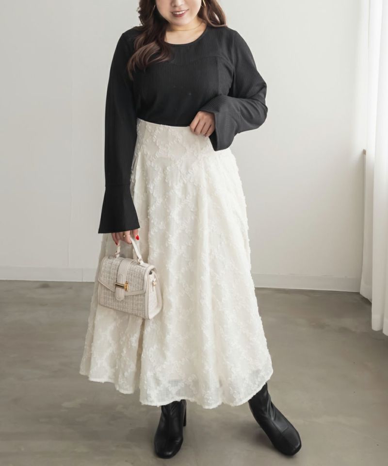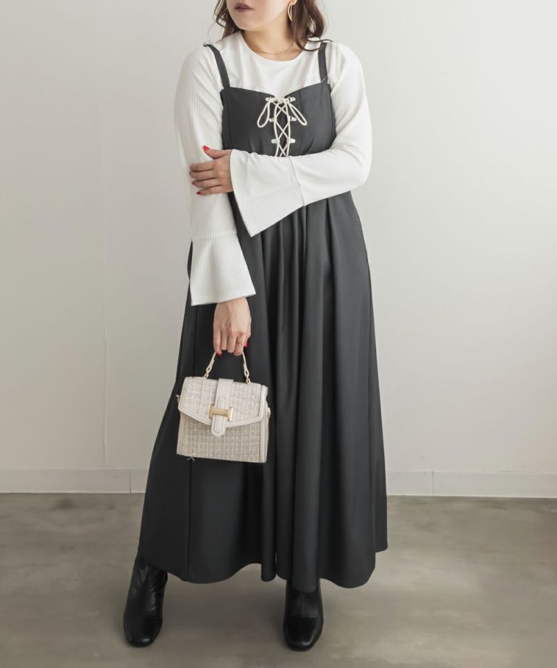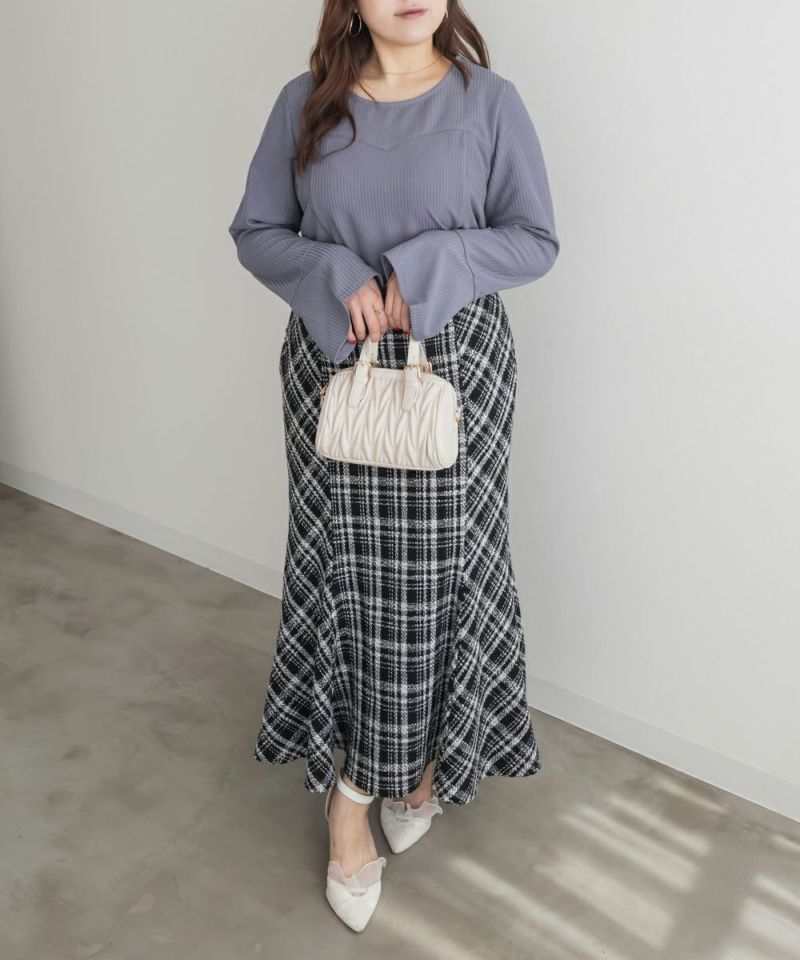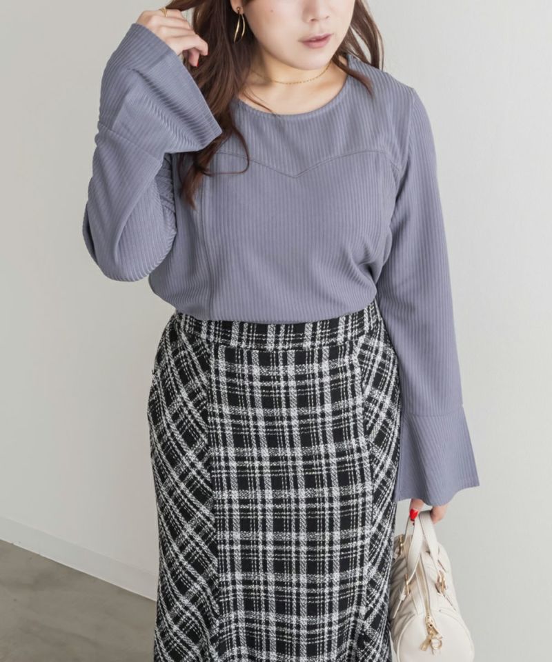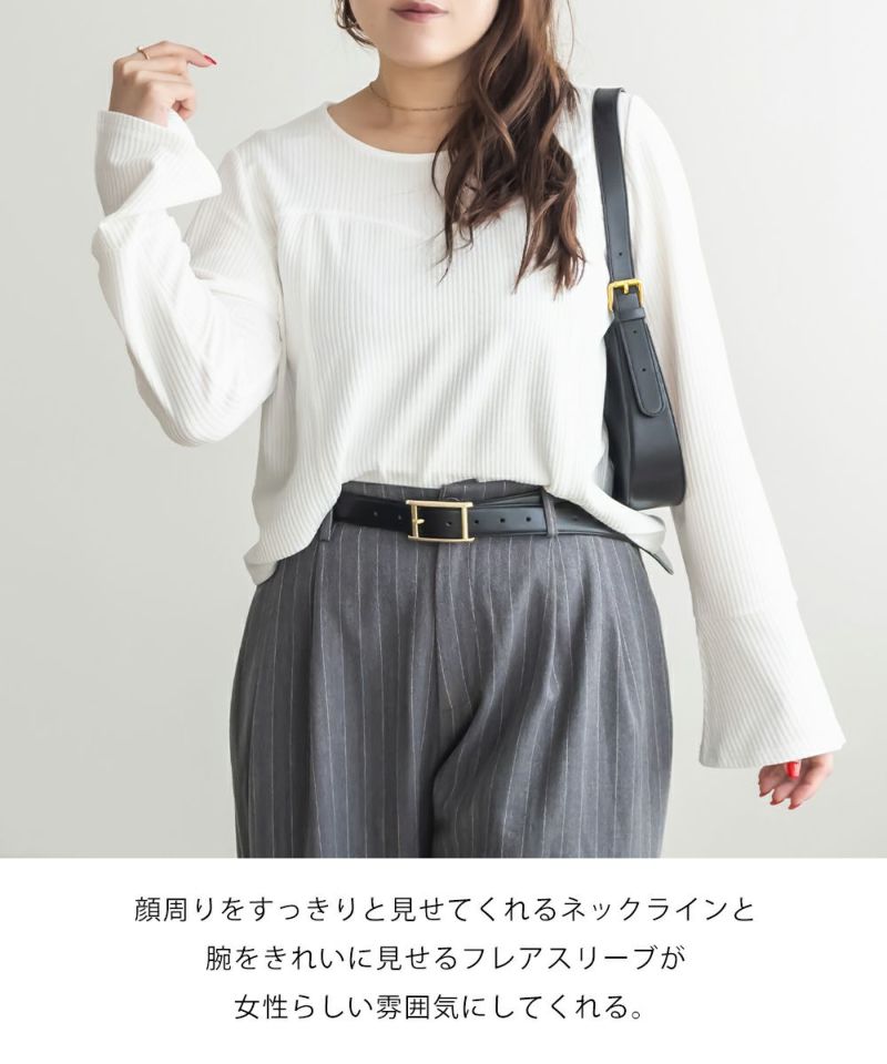 3Lサイズを着用しました。着用感はちょうどいいです。ビスチェを重ね着したような切替デザインがポイントのプルオーバーで、1枚でレイヤード風コーデが完成します。リブ素材の程よいフィット感が身体のラインをきれいに見せつつ、伸縮性があるので動きやすく快適です◎ 袖口に向かって広がるデザインが手元を綺麗にみせてくれます♪すっきりとしたシルエットで、アウターを重ねてももたつかないのが嬉しいポイントです。デニムやスカートなど、ボトムを選ばず着回しやすく、シンプルながら着映えするアイテムです。