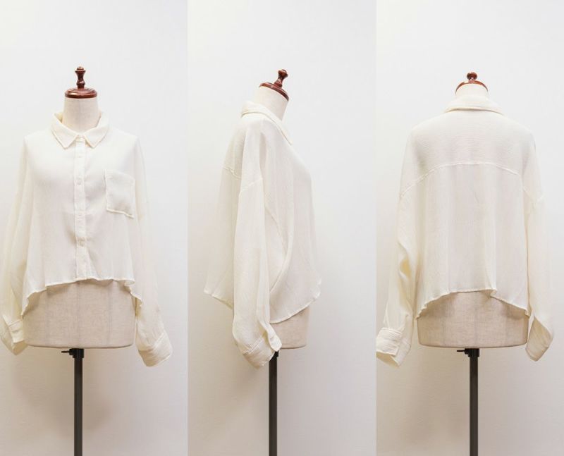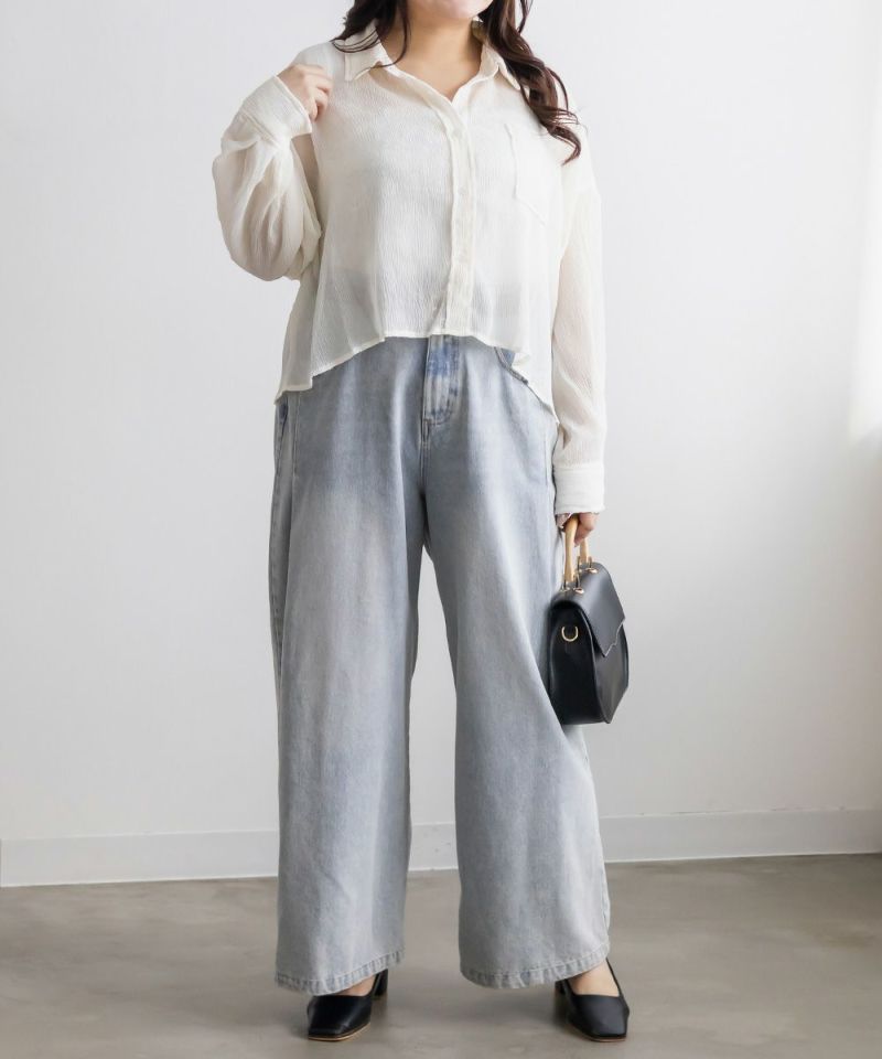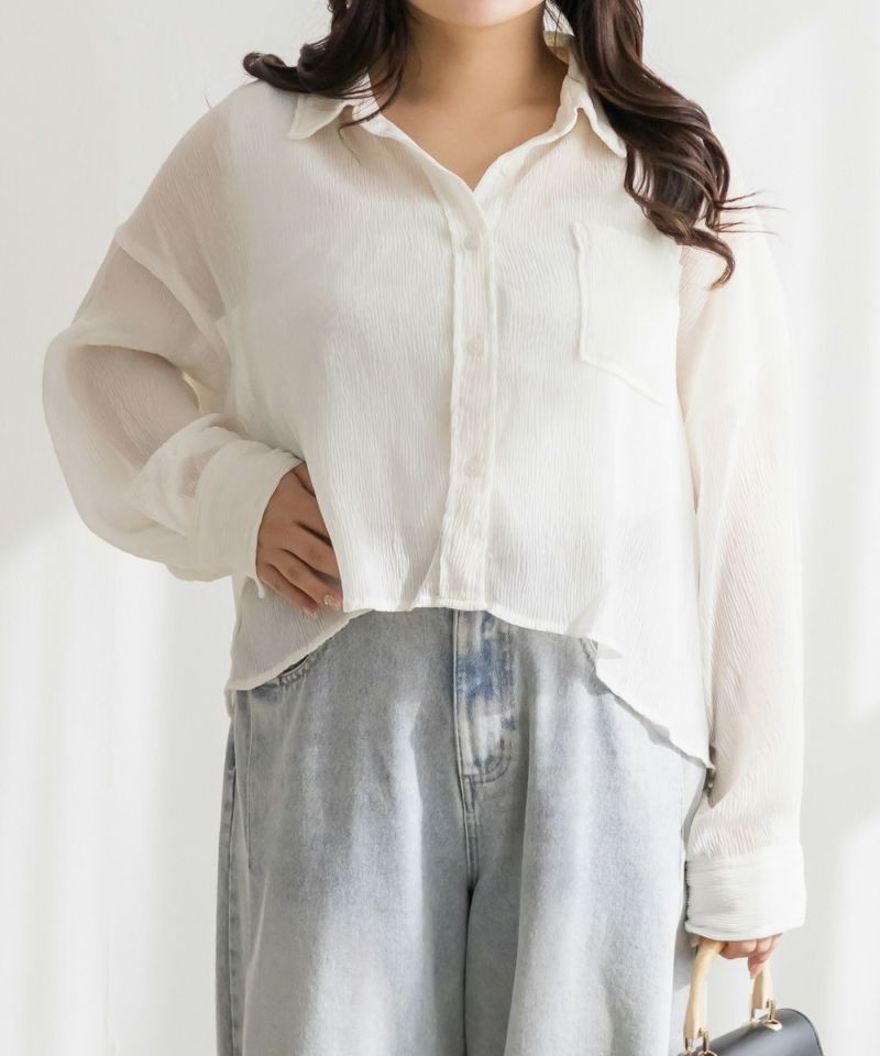3Lサイズを着用しました。さらっとしてて軽やかな着心地です!透け感が可愛いシアー素材で、少し楊柳っぽい凹凸の生地がかわいいです◎シアーの素材が上品で、カジュアルにもきれいめにも合わせやすい万能アイテムです。短丈なので、アウトしてちょうどよくスタイルアップして見えました!オールシーズン使いまわせるシャツはバリエーション違いでもっておきたいアイテムです♪