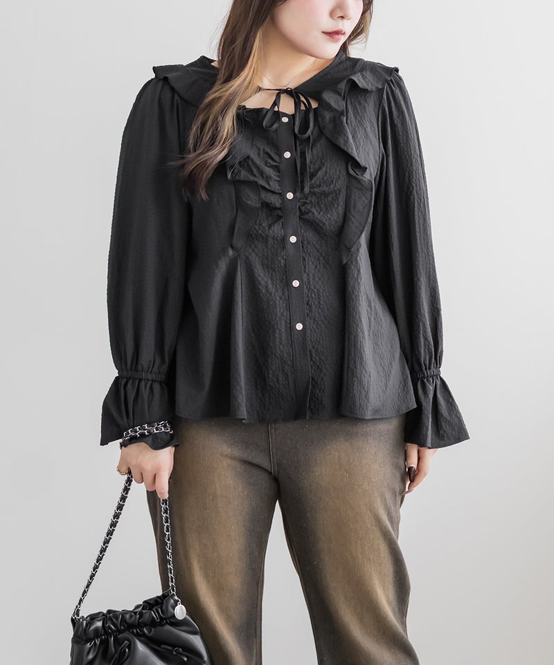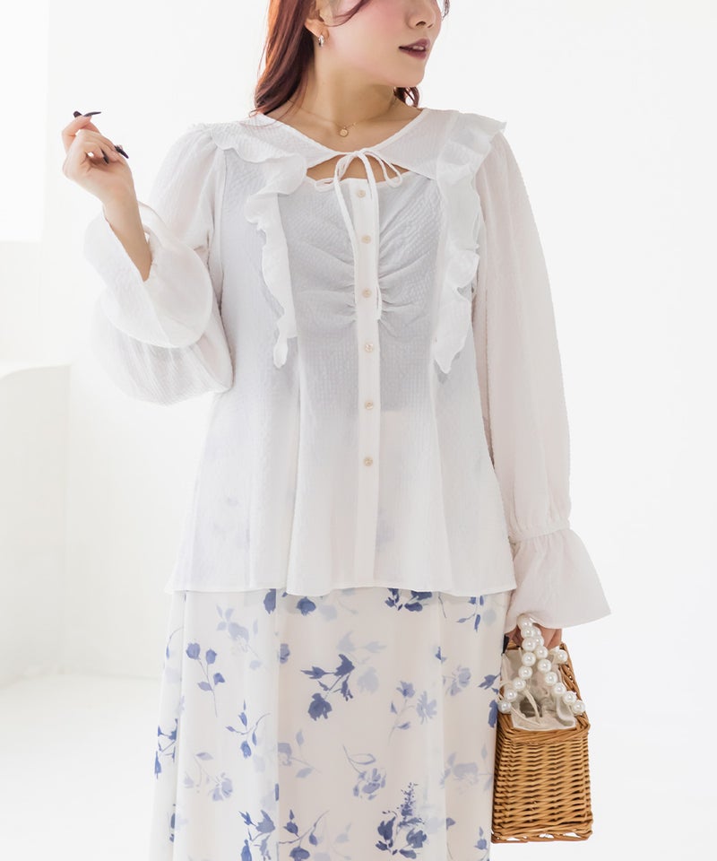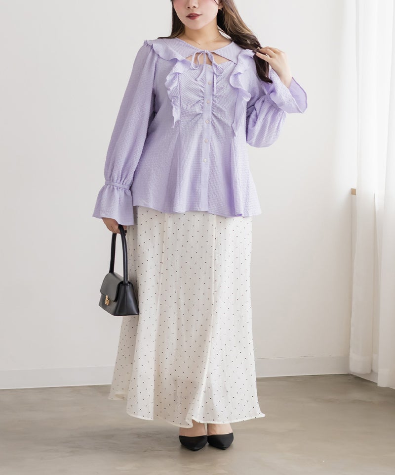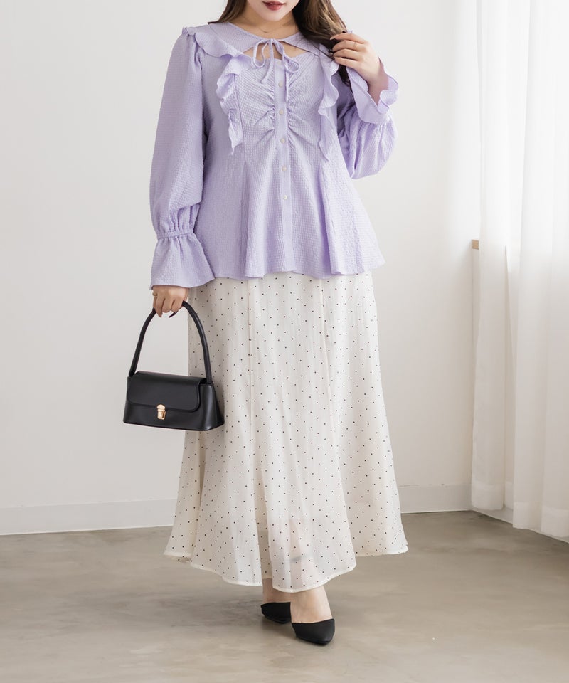 3Lサイズを着用してちょうどいいサイズ感でした。ウエストにタックが入っていて切替が無いのにメリハリが出てすっきりした印象で着用できました♪デコルテのリボンは女性らしいポイントになってネックレスいらずなのも嬉しいです◎ウエストはくびれて見えるデザインでスタイルアップ効果も◎凹凸のある軽い生地で長いシーズン着やすいです。袖もふんわりして二の腕カバーもバッチリで、デートやお出かけに着ていきたくなる1枚で着映えするブラウスです!