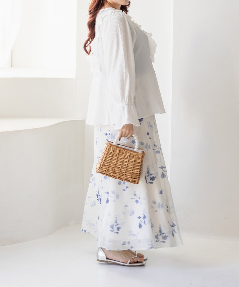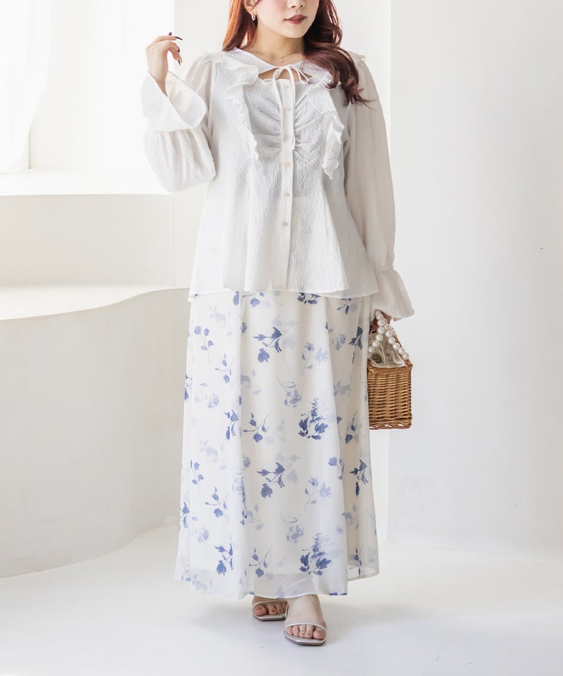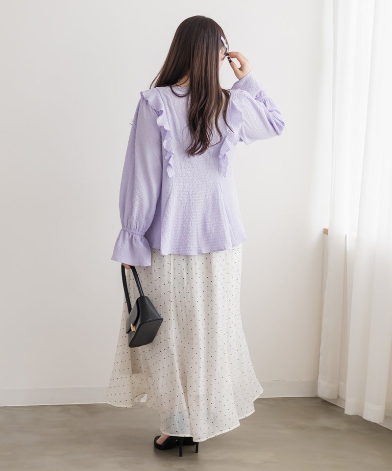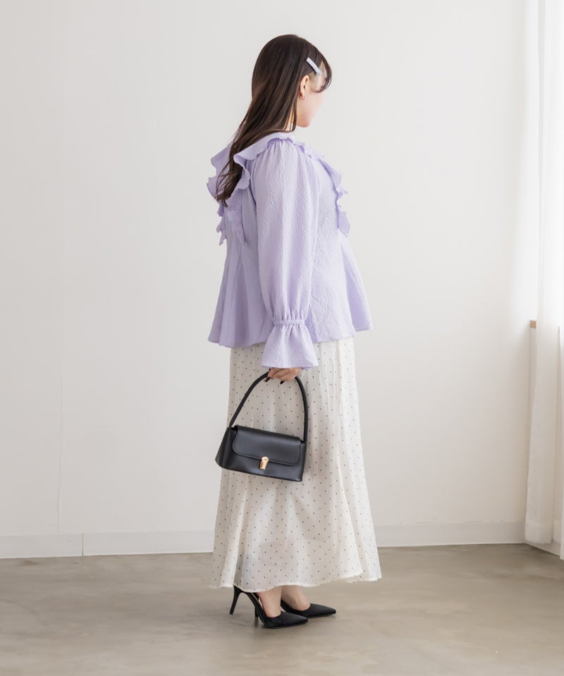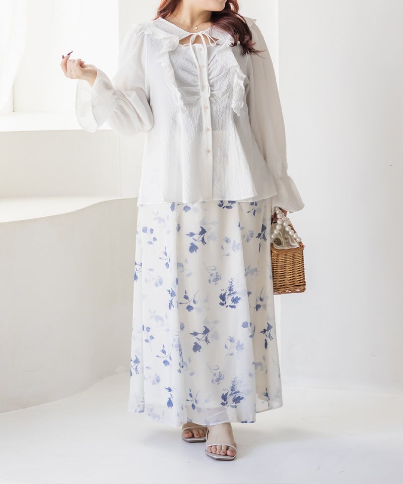 3Lサイズを着用してちょうどいいサイズ感でした。ウエストにタックが入っていて切替が無いのにメリハリが出てすっきりした印象で着用できました♪デコルテのリボンは女性らしいポイントになってネックレスいらずなのも嬉しいです◎ウエストはくびれて見えるデザインでスタイルアップ効果も◎凹凸のある軽い生地で長いシーズン着やすいです。袖もふんわりして二の腕カバーもバッチリで、デートやお出かけに着ていきたくなる1枚で着映えするブラウスです!