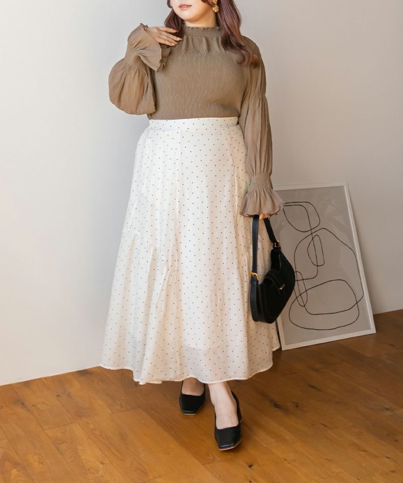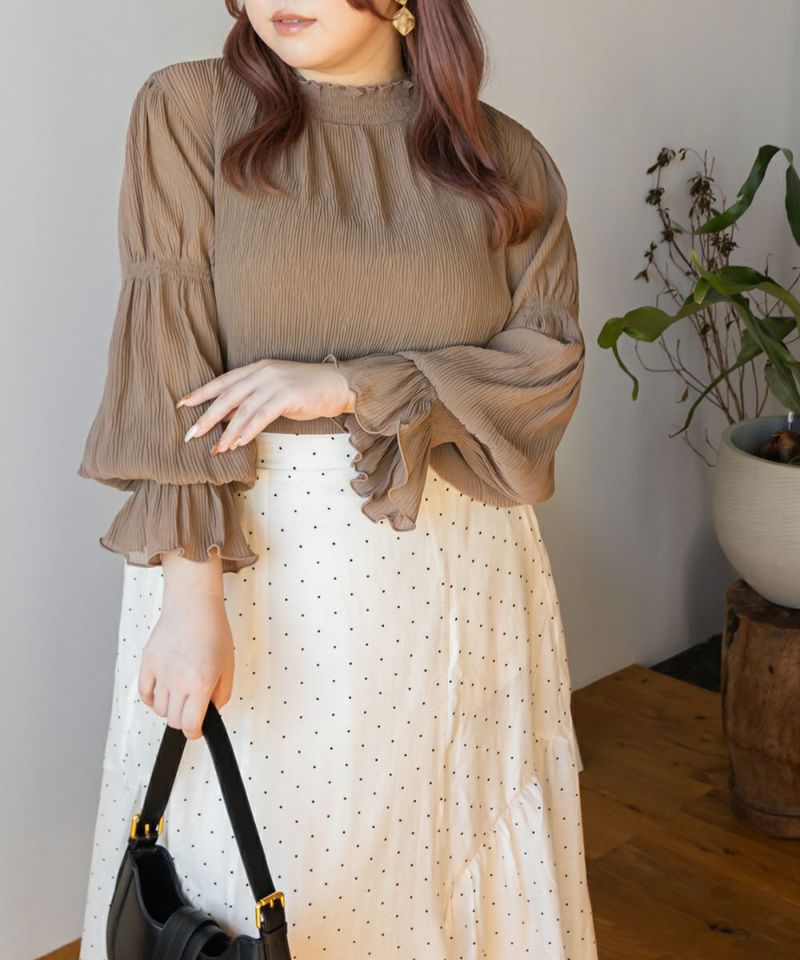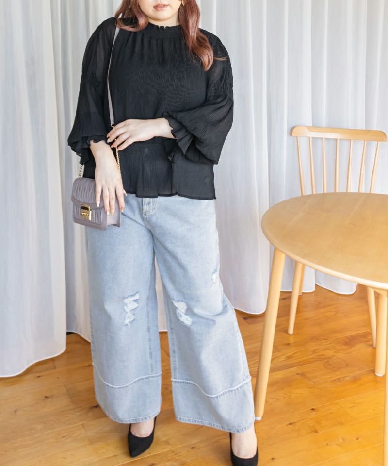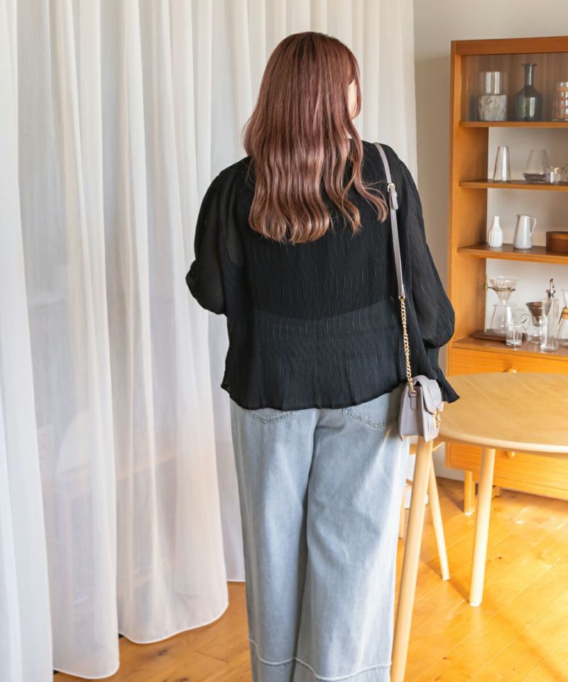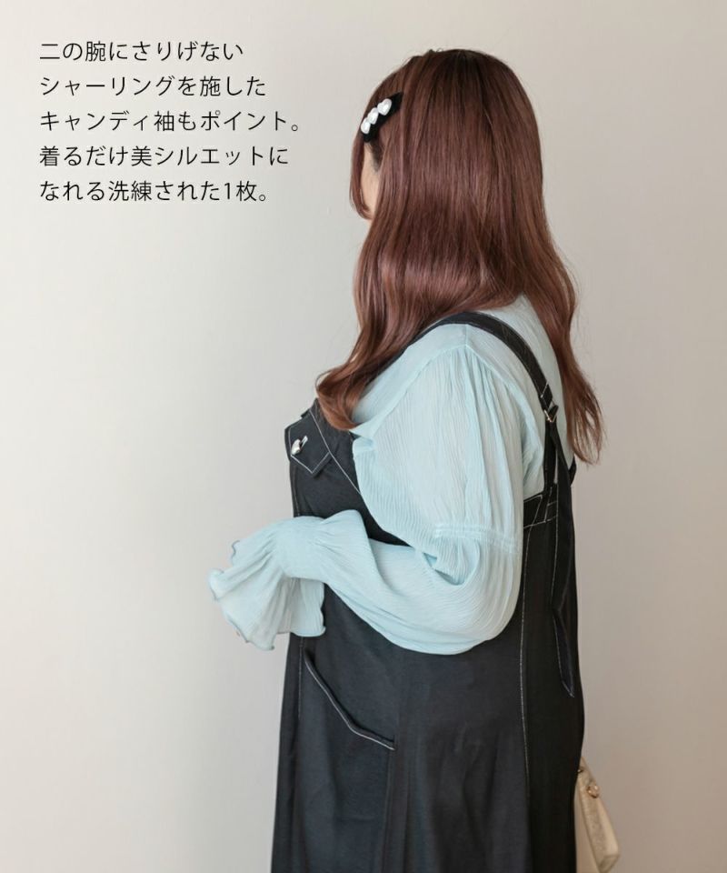 3Lを着て首も窮屈感なく、ゆとりをもって着ることができました。ゆったりとしたシルエットのプリーツのような表面感のあるシアー素材だから肌の透け感を気にせずに着ることができました◎いやらしさのない上品な雰囲気で、ネックや袖の繊細なシャーリングがとっても女性らしいです♪腕まくりしても可愛いシルエットに変化できます!袖口のフレアが手元を美しく見せてくれるのもポイント◎主役のトップスとしても、ワンピースのインナー使いとしても活躍できます。ほぼオールシーズン使える、1枚あると便利なアイテムです!