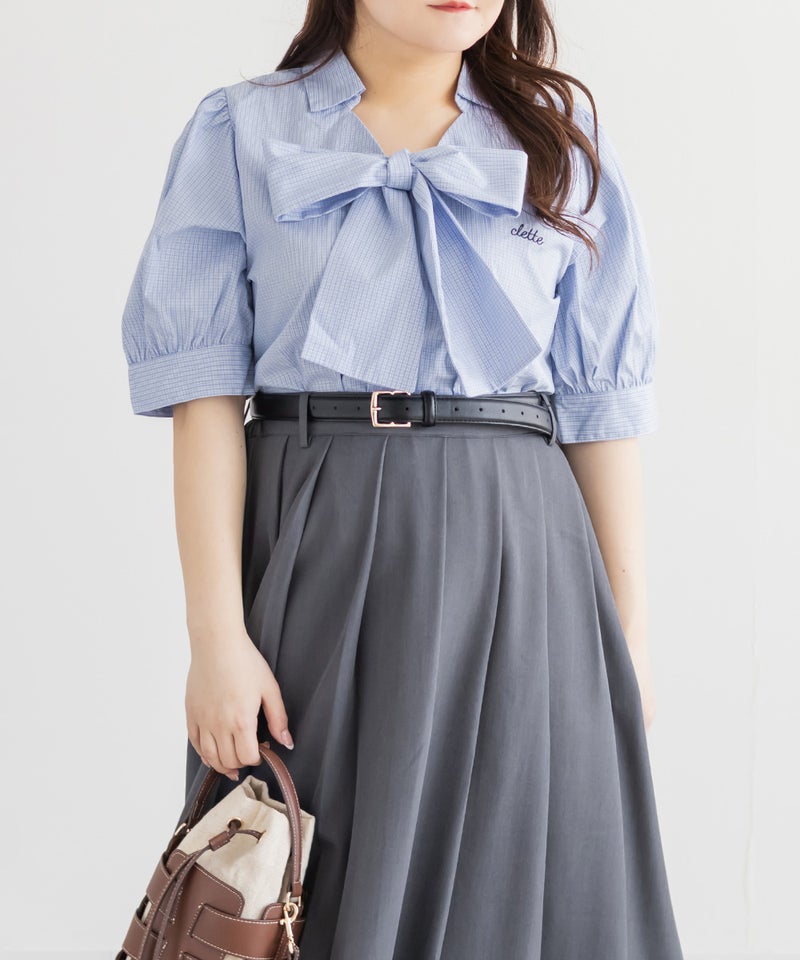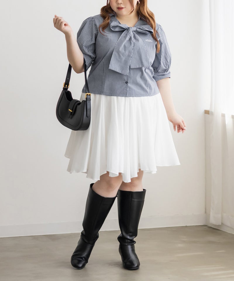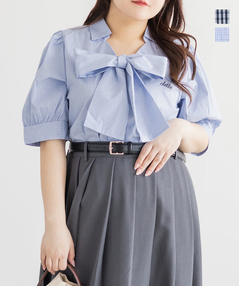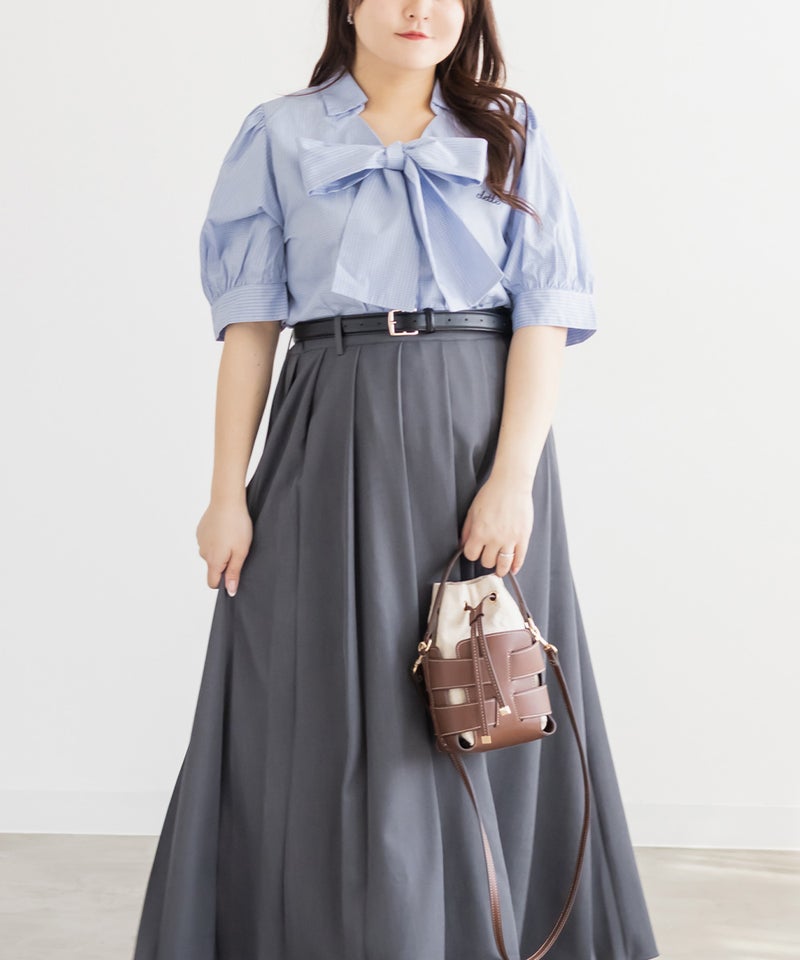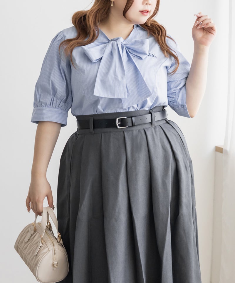 3Lを着てちょうどいい着心地でした。ボタンの開きも気にならず安心して着られました♪ さらっとハリのあるシャツ地で、上品な印象です!リボンタイは取り外しができるので、ガーリーにもカジュアルにも着回せて便利です◎ 肘まで隠れる袖も嬉しいです!デニムやスカート、どんなボトムにも合わせやすい万能ブラウスです。