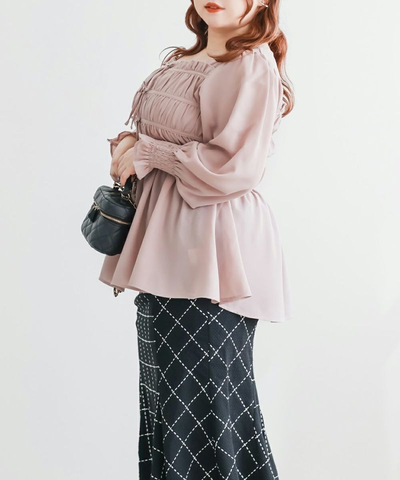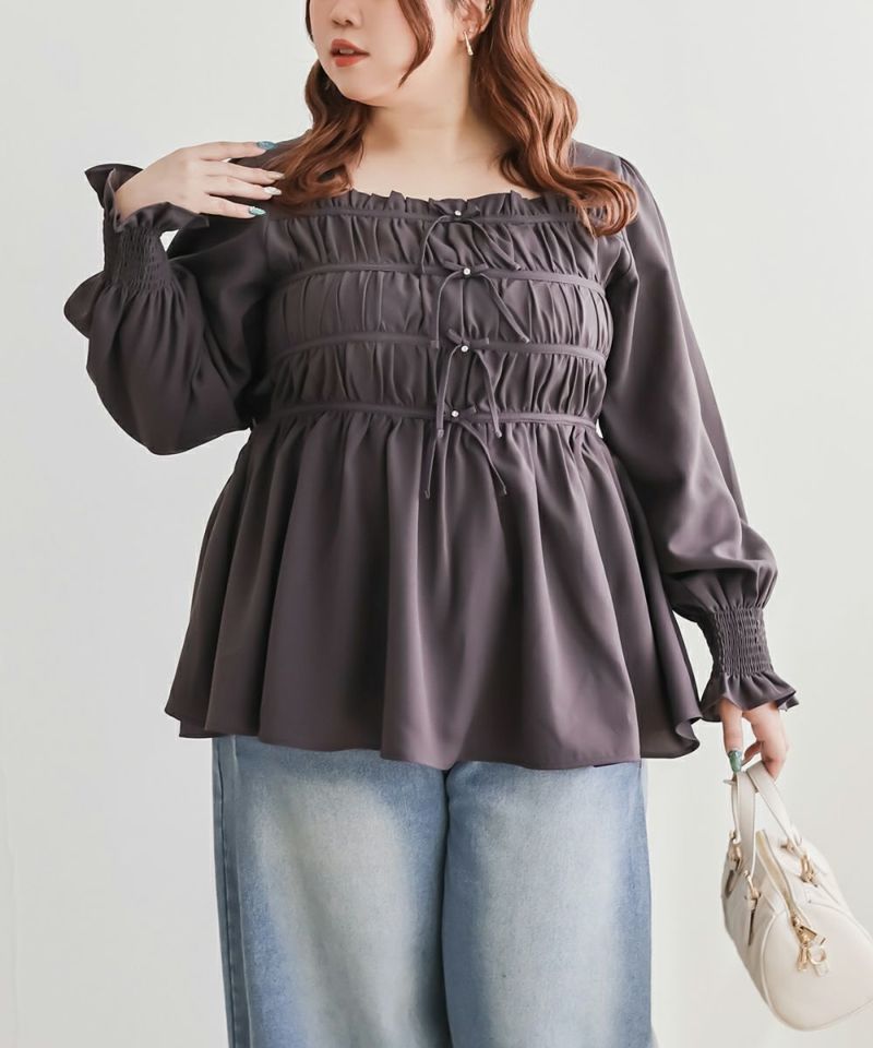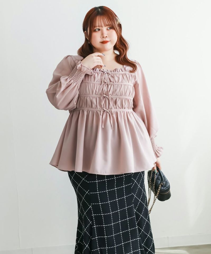 3Lサイズを着用して、ちょうどいいサイズ感で着ることができました◎バストからウエストまではシャーリングゴムでボディラインをカバーしながらフィット感があり着やせできるデザインでした。フロントのリボンにはビジューもついていてガーリーながら高級感のある上品な雰囲気に。ふわっと軽やかな生地感で肌なじみもよく、さらっと快適に着られそうです♪リボンは甘すぎず、さりげないポイントになっているので、大人っぽさをキープしながら可愛さも楽しめるデザインです。袖も程よくゆったりしていて、二の腕を自然にカバーしてくれるのが嬉しいポイント。デニムやワイドパンツと合わせてカジュアルに、きれいめなボトムと合わせればお仕事などにもぴったりな万能ブラウスです!