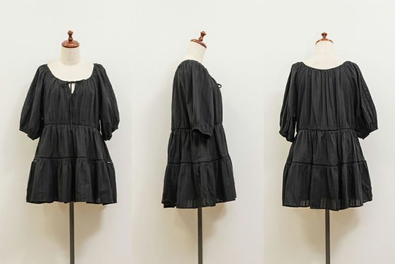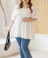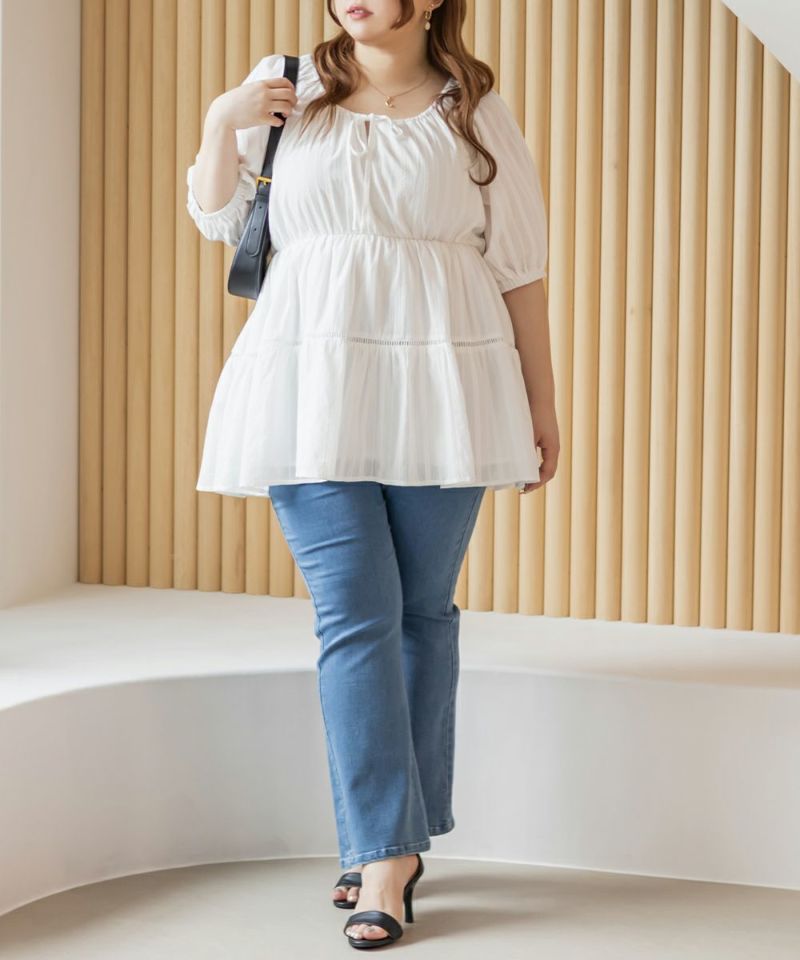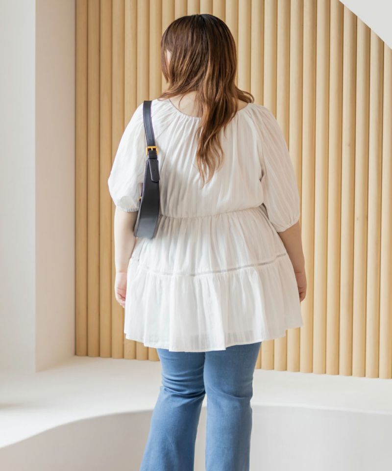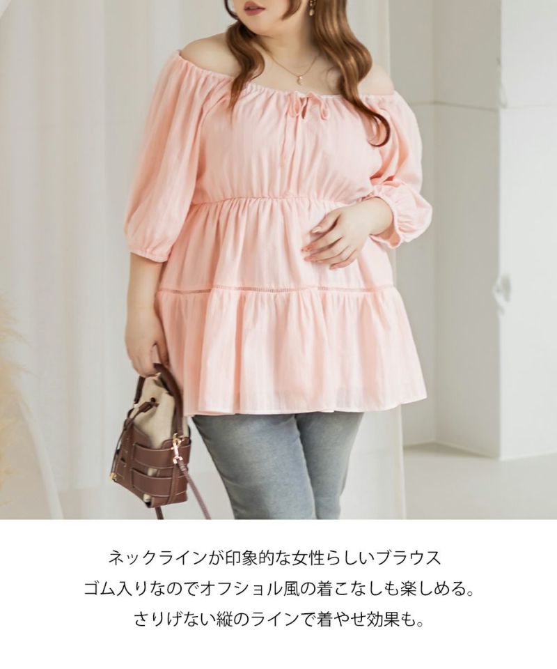 3Lを着用して、ちょうどいい着心地でした。いつもどおりのサイズ選びで問題なさそうです。ウエストや襟ぐりはゴムが入っていて、窮屈感も無く着られました!肩を落としてオフショルにもなる2WAYデザインで、ゴム入りだからずり落ちてしまう心配もなさそう♪ゆるっとしたサイズ選びよりジャストサイズでのサイズ選びをお勧めします◎お尻まですっぽり隠れる着丈なのも着やせ出来て嬉しいです。繊細なレース生地が今っぽくて、袖以外裏地もついているので透ける心配もなく安心して着られました。春~夏大活躍するブラウスなので、お出かけやデート・旅行にもおすすめの1枚です!