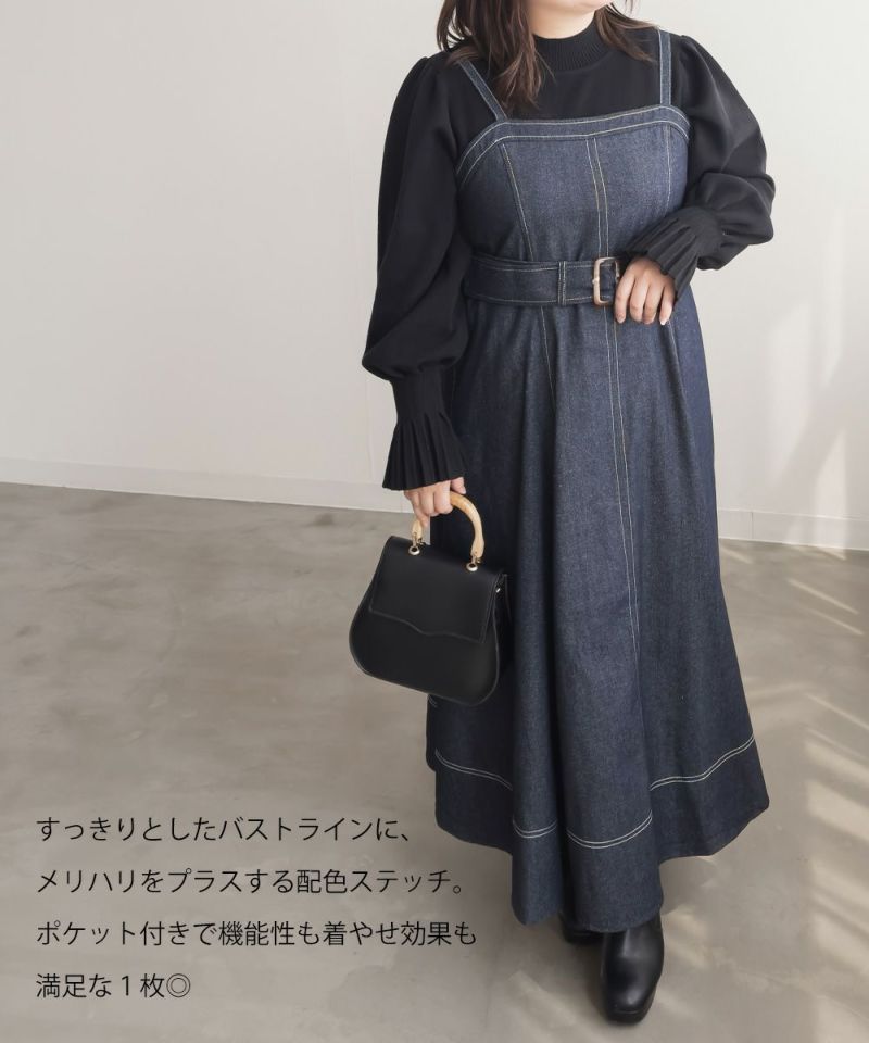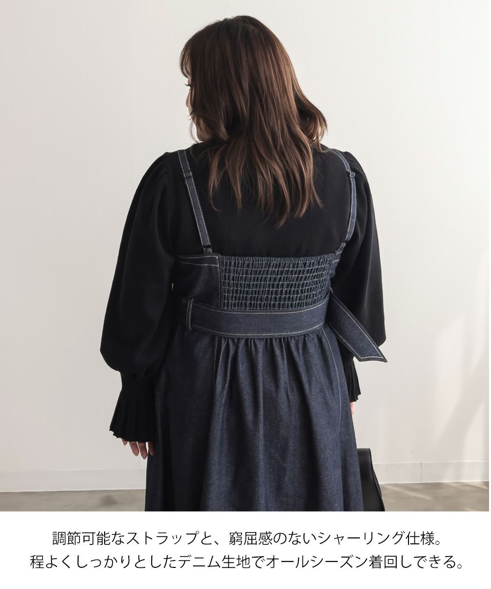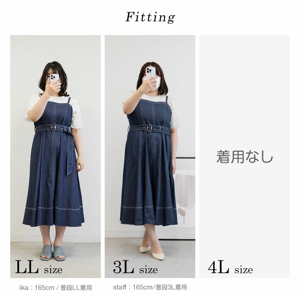 3Lを着て丁度いいサイズでした。上半身すっきりしながらお腹やお尻をしっかりカバーしてくれる着やせできるデザイン。綺麗なシルエットだけど窮屈感のない着心地だからストレスフリーにお出かけできちゃいます◎美人見えするシルエットだから、デニム生地でもカジュアルになりすぎずに大人っぽい着こなしになれます!オールシーズン使えて着映えするワンピースです♪