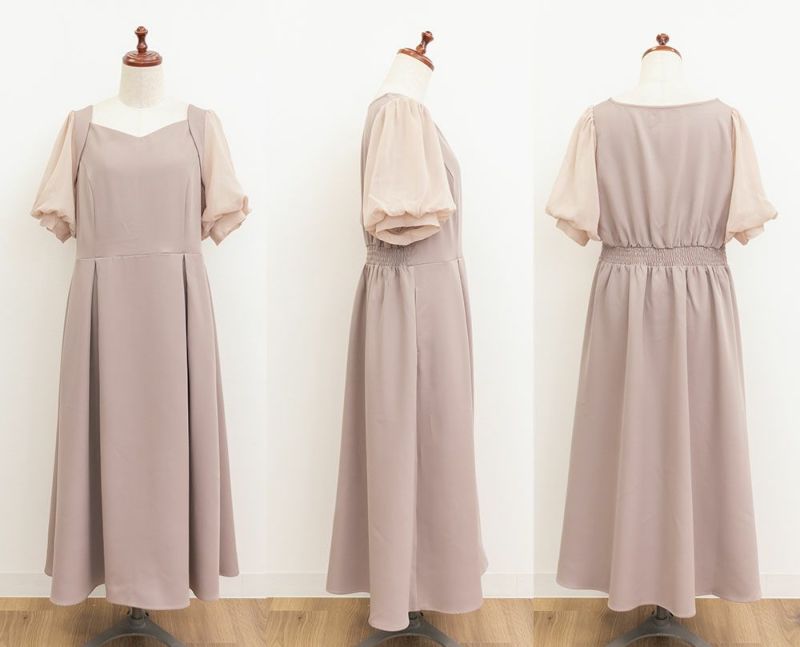 3Lを着てちょうどいいサイズでした。顔回りすっきりとしたとっても女性らしいデザインで、肩から袖口にかけてふんわりとしたパフスリーブだから、可愛いうえに、肩の丸みをカバーしつつ二の腕をしっかり隠してくれます。袖がほんのり透けるシアー素材なのも可愛いです。上品な雰囲気で、二次会やちょっときちんと感が必要な華やかなシーンなどにもおすすめです◎ウエストのボックスタックがお腹周りもしっかりカバーします!着るだけで美人度が上がるワンピースです♪