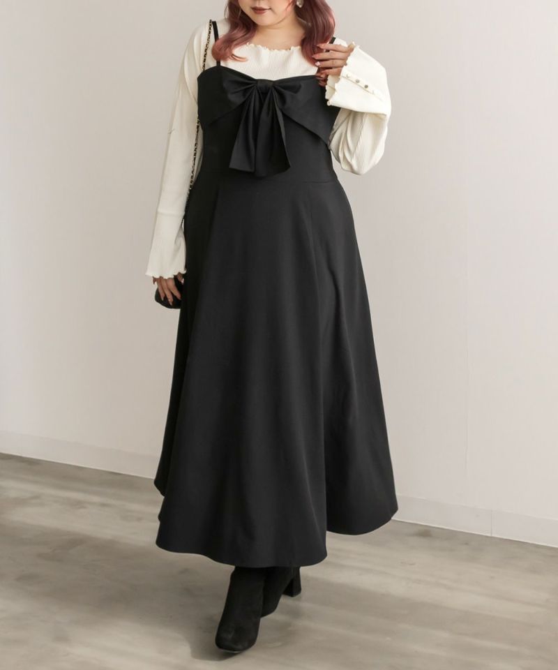 3Lを着て丁度いいサイズでした。後ろシャーリングが窮屈感なく身体にフィットして、ウエストからフレアに広がってくれるから、お腹やお尻を隠しつつ着やせできます◎大き目のリボンがついたデザインが可愛くて着映えします♪リボンがあることによってボディラインをカバーしてくれるだけでなく小顔に見える視覚効果もあります!インナーを変えてオールシーズン使えるワンピースです!