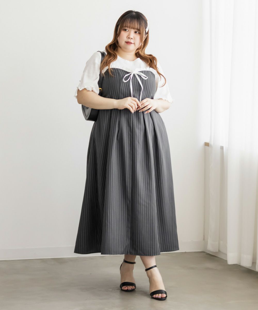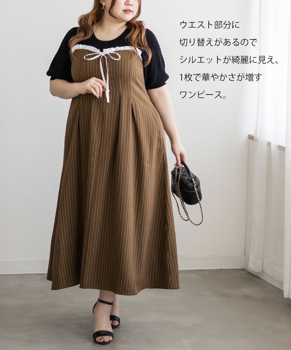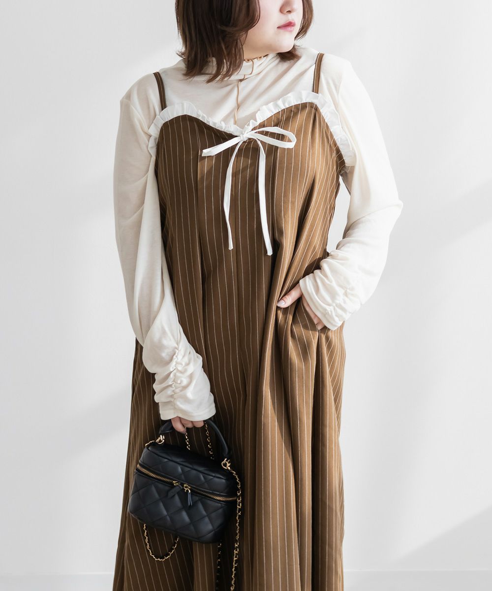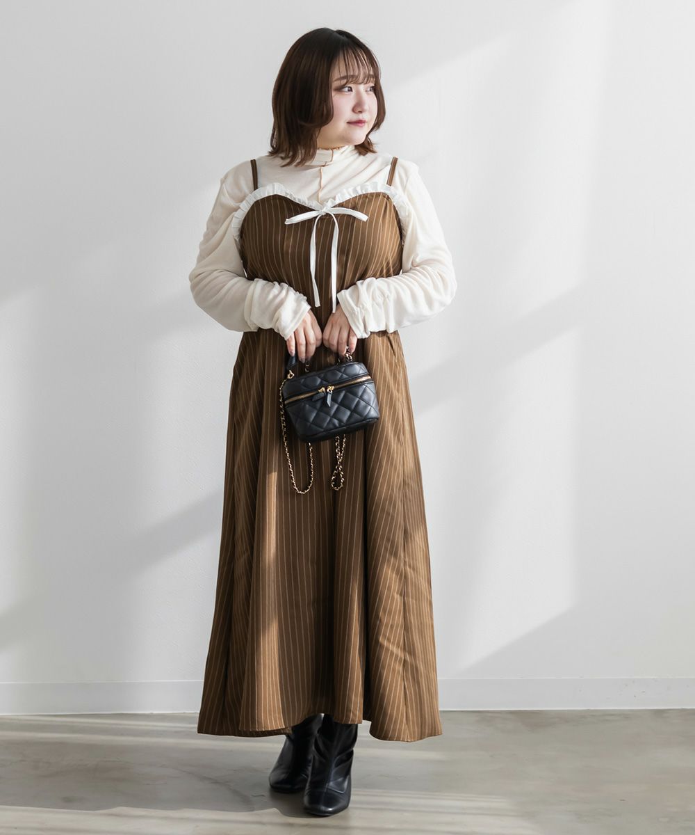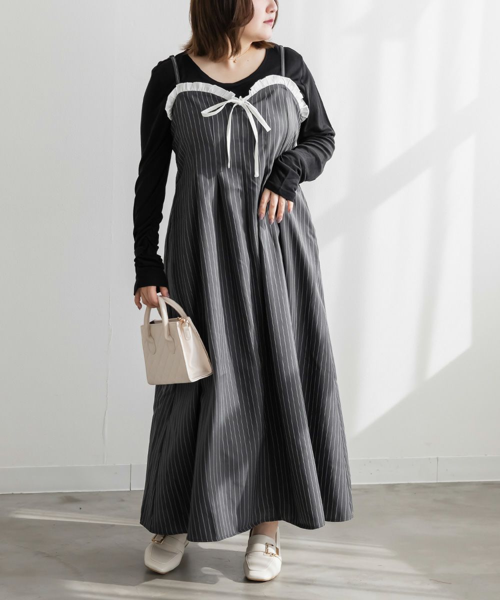 3Lを着て、見頃なども丁度良くすっきり綺麗に着用出来ました。後ろはゴムなので、フィット感がありながら窮屈感はなかったです!ウエスト部分にタックがたっぷり入っていてお腹周りもすっきりカバーしてくれます!すらっとしたシルエットながら、しっかりボディラインをカバーしてくれるディティールでした。ストライプ×リボン×フリルのときめき要素が詰まったキャミワンピで、アジャスター付きで肩紐の長さを調整できるので、バスト位置もちょうどよく着られました。Tシャツやブラウスを合わせて甘めに、シンプルなトップスでカジュアルに、着回し力も抜群の一枚です◎