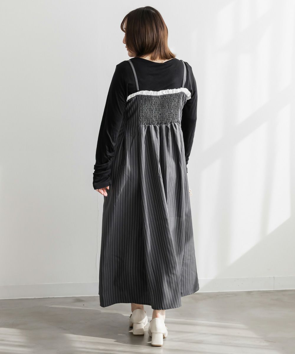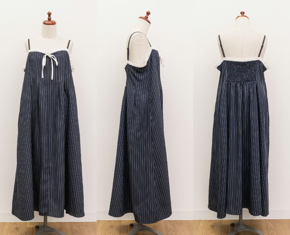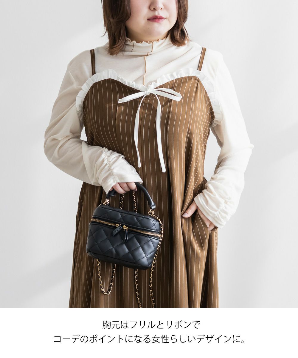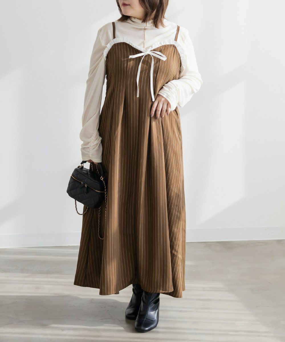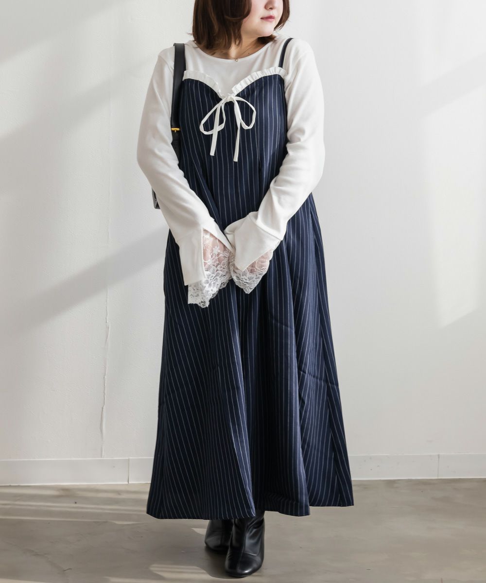 3Lを着て、見頃なども丁度良くすっきり綺麗に着用出来ました。後ろはゴムなので、フィット感がありながら窮屈感はなかったです!ウエスト部分にタックがたっぷり入っていてお腹周りもすっきりカバーしてくれます!すらっとしたシルエットながら、しっかりボディラインをカバーしてくれるディティールでした。ストライプ×リボン×フリルのときめき要素が詰まったキャミワンピで、アジャスター付きで肩紐の長さを調整できるので、バスト位置もちょうどよく着られました。Tシャツやブラウスを合わせて甘めに、シンプルなトップスでカジュアルに、着回し力も抜群の一枚です◎