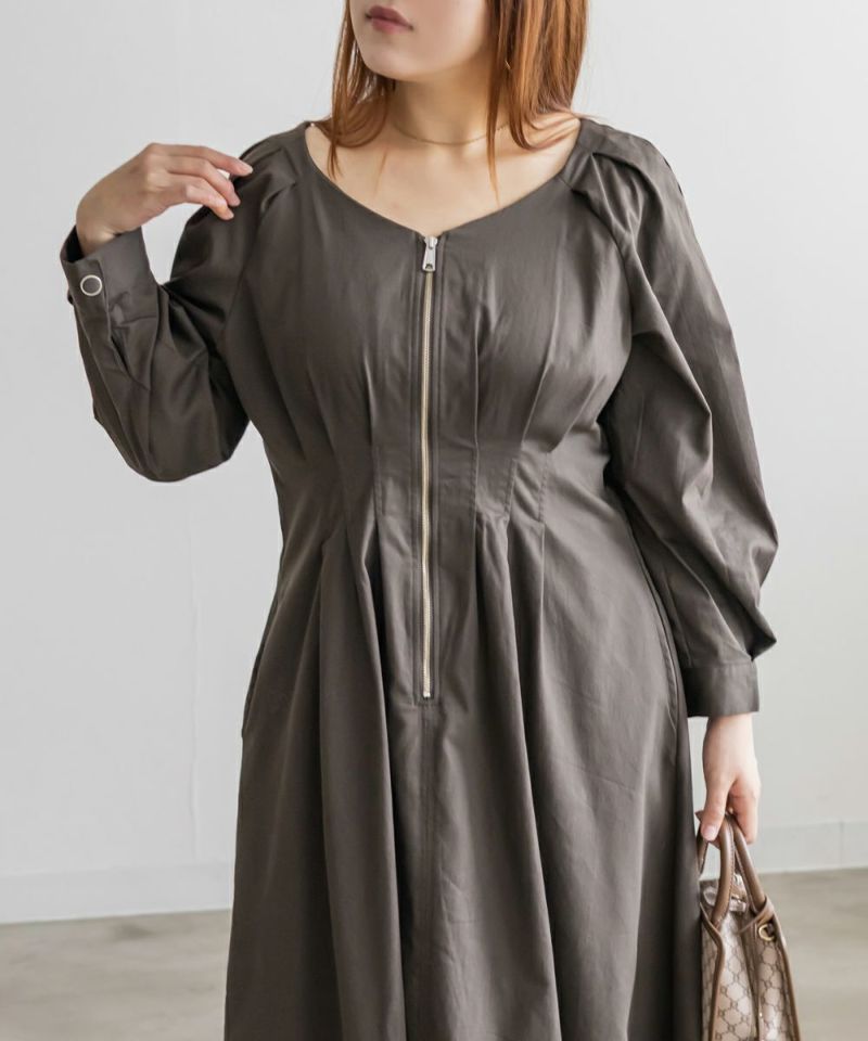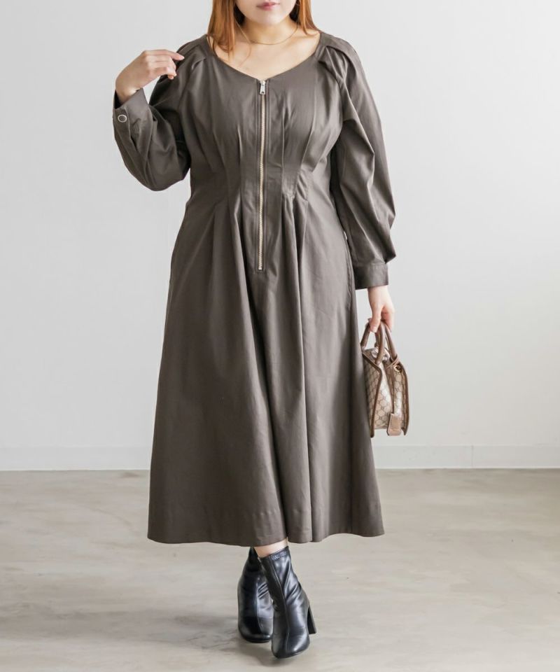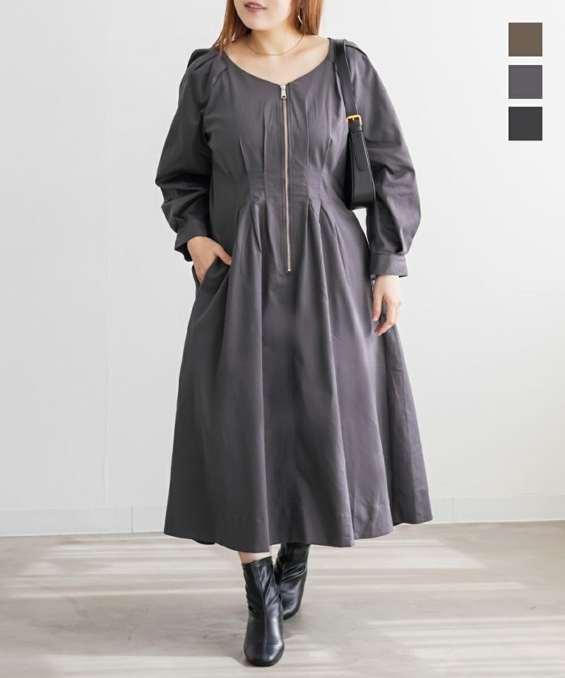 3Lサイズを着てちょうどよく楽な着心地でした!程よくハリのある生地なのでボディラインを拾わないのが嬉しいです♪ウエストにタックが入っていて、フィット&フレアシルエットになって女性らしいシルエットで着られます。ブーツやスニーカー、小物使いを変えるだけで違った印象に変化できます。フロントジップなのでメリハリが付いて、すっきりとした印象です。シンプルながら季節感もあってデザインなので、お出かけやデートにもおすすめです!
